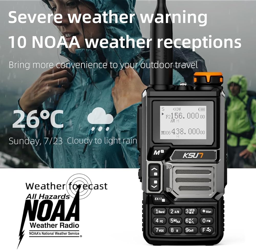 قنوات الطقس NOAA: يدعم هذا الراديو ثنائي الاتجاه 10 قنوات طقس NOAA، مما يسمح لك بتلقي معلومات التحذير من الطقس في الوقت المناسب أثناء تواجدك بالخارج. وهذا مفيد بشكل خاص للأفراد الذين يعملون في البيئات الخارجية، مثل البناء أو الزراعة أو صيد الأسماك، حيث يمكن أن يساعدهم على الاستعداد للتغيرات المفاجئة في الطقس.