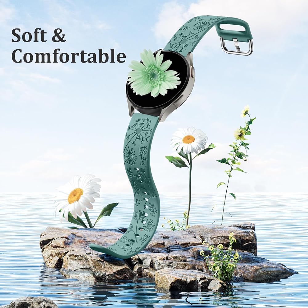 【سهلة التركيب والإزالة】: تم تصميم أحزمة ساعة Samsung Watch 6/5/4 المنقوشة على شكل زهرة مع عروات زنبركية سريعة التحرير في كلا طرفي السوار مصنوعة بتقنية اتصال سلسة، قم بتمرير الدبوس في فتحة الساعة، أشرطة ساعة سريعة الفك مقاس 20 مم مع دبابيس على كلا الطرفين تُغلق بدقة وأمان على واجهة الحزام، والإبزيم المعدني آمن وثابت. إنه مريح للارتداء طوال اليوم دون قيود