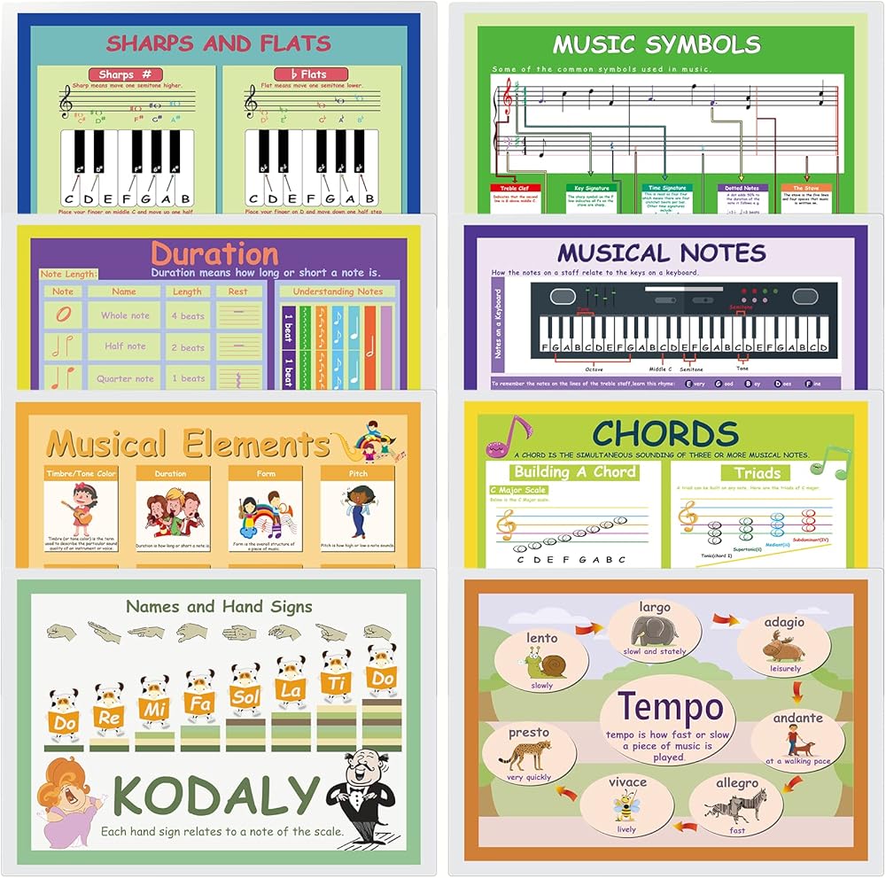 مجموعة من 8 ملصقات موسيقية (مغلفة) من FUNNYLAND للفصول الدراسية، ومخططات نظرية الموسيقى الأساسية للمدرسة، وملصقات جدارية للأطفال - مثالية للفصل الدراسي والمنزل ومراكز التعليم