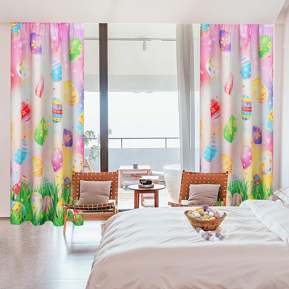 تصميم رائع: ستائرنا الملونة تستخدم بشكل أساسي عناصر بيضة عيد الفصح الشهيرة، المليئة بأجواء الاحتفالات. اصطدام البيض الملون بالعشب الأخضر يجعل الستائر مفعمة بالحيوية والألوان النابضة بالحياة. مناسبة لغرفة النوم، وغرفة المعيشة، وغرفة الأطفال، ونوافذ الفنادق، وما إلى ذلك.