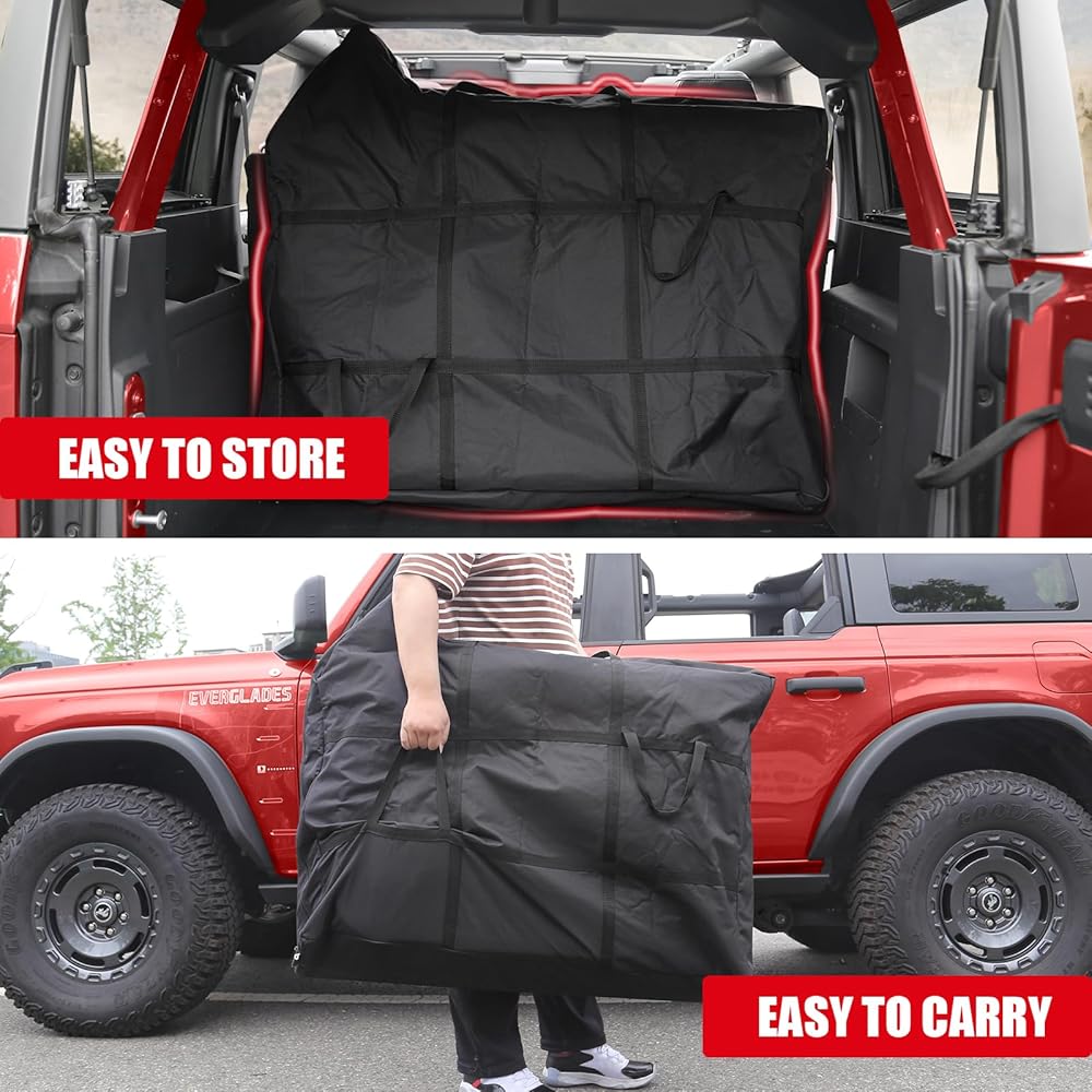 الاستخدام: عند إزالة أبواب السيارة الأصلية، توفر هذه الحقائب حلاً تخزينيًا عمليًا وفعالاً. قم بتخزين أبواب برونكو الخاصة بك بأمان في هذه الحقائب، مما يبقيها محمية ومنظمة.