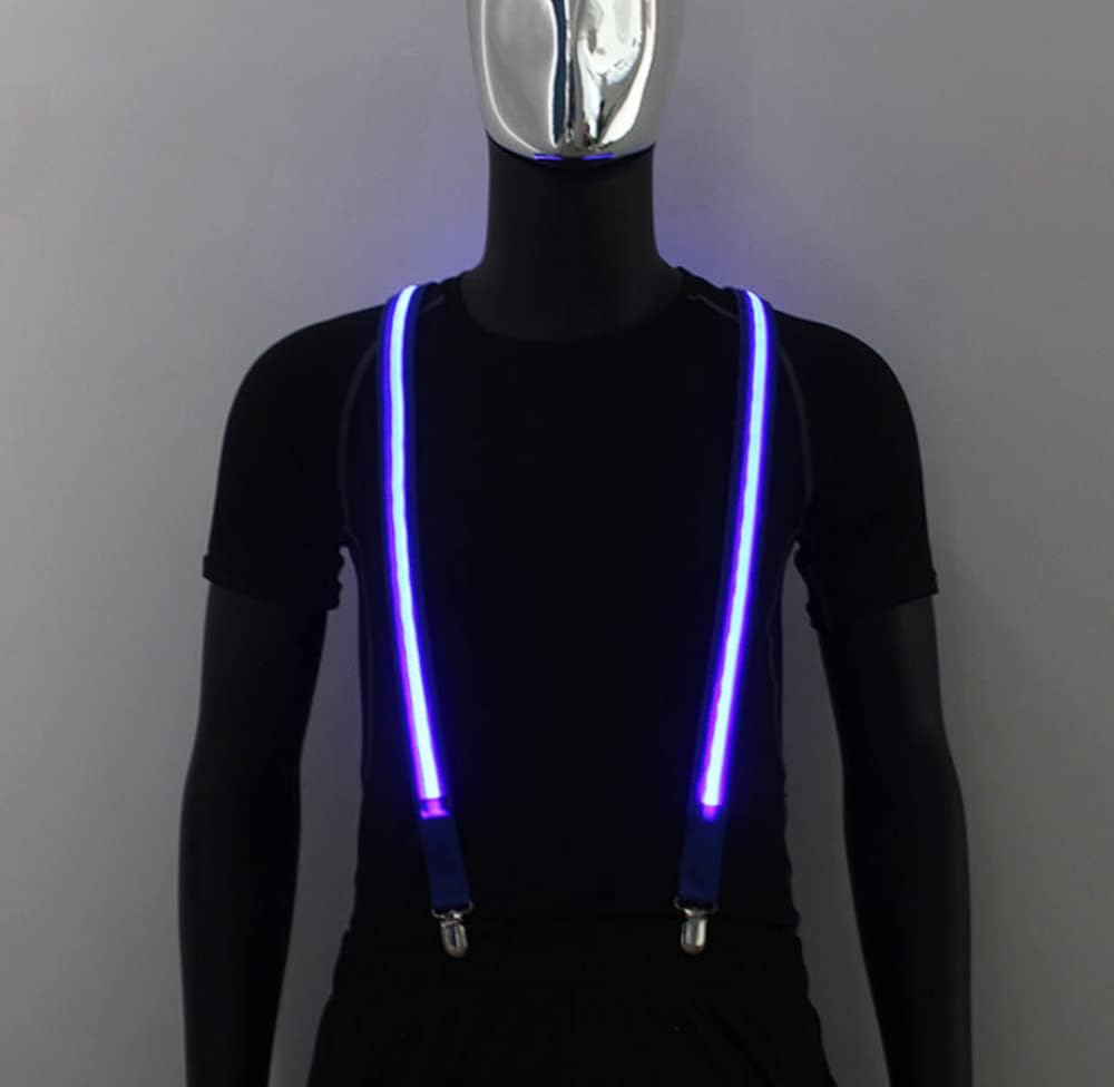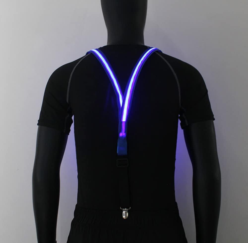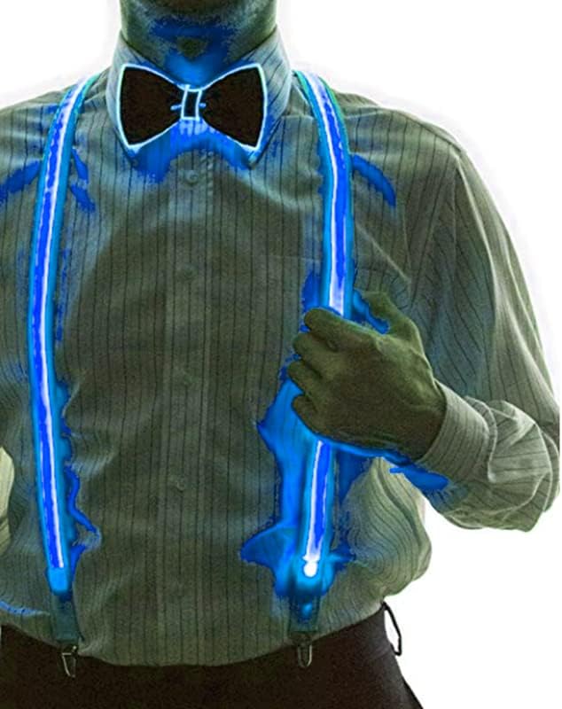 حمالات LED: وحدة التحكم في الإضاءة تأخذ بطارية AAA واحدة ولها 3 إعدادات: تشغيل كامل، وميض، وإيقاف. يتم تثبيت حزمة البطارية في منطقة أسفل الظهر من ربطة العنق