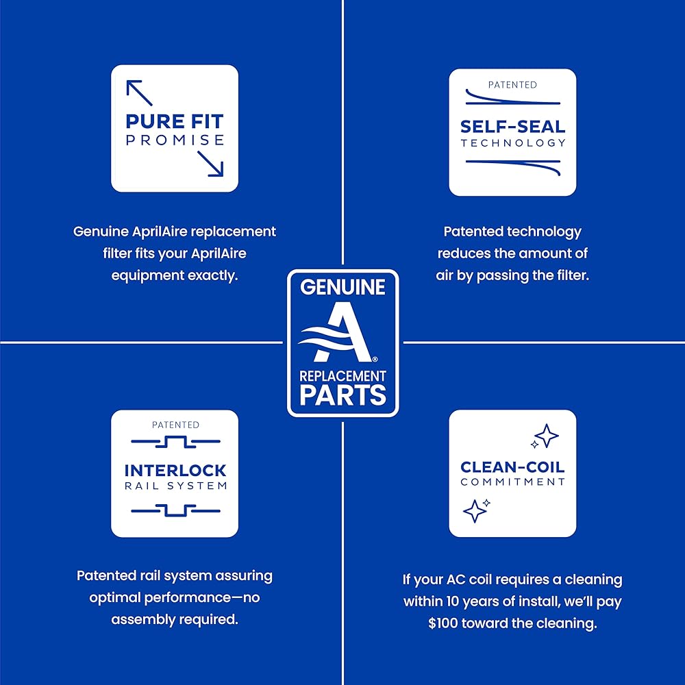 • أداء أفضل بفضل تقنية AprilAire Self-Seal الحاصلة على براءة اختراع والتي تقلل من كمية الهواء التي تتجاوز الفلتر