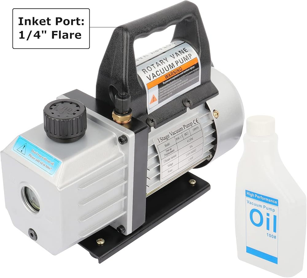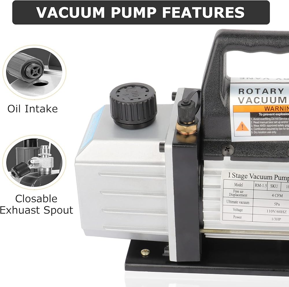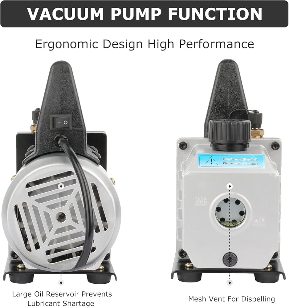 مضخة فراغ دوارة دوارة: تم تصميم مضخة تفريغ مكيف الهواء الدوارة 4CFM بغلاف من سبائك الألومنيوم عالي الجودة للتهوية الجيدة وتبديد الحرارة، وتم تصميم المحرك والمضخة ككل، وهو أكثر إحكاما وخفيفة ومعقولة، مع قوة محرك 1/3 حصان وضغط نهائي 5 باسكال.