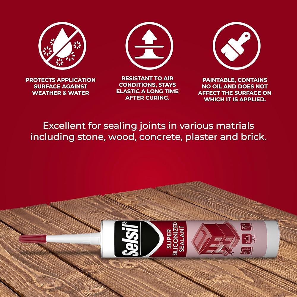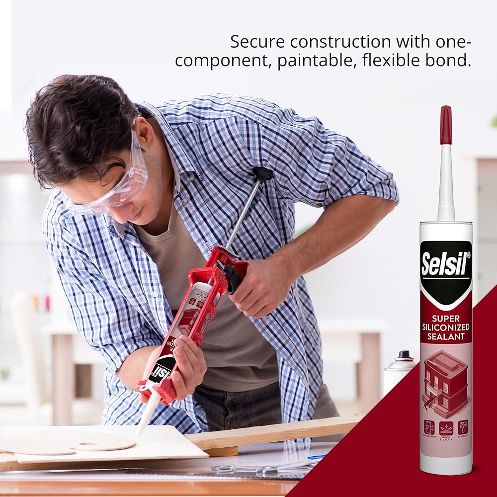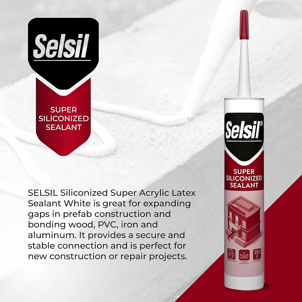 مانع التسرب للبناء: يوفر مانع التسرب الأكريليكي المصنوع من السيليكون Selsil رابطة قوية ومتينة عند تجميع نجارة الخشب والبلاستيك والحديد والألمنيوم. مصممة لتحمل الاستخدام المنتظم. بفضل متانته وقوته، يعد مانع التسرب هذا مثاليًا لمشاريع البناء والمشاريع اليدوية التي تتطلب إغلاقًا موثوقًا.