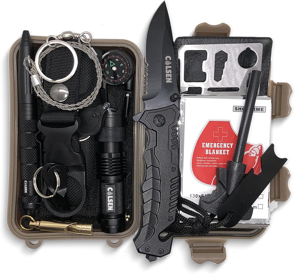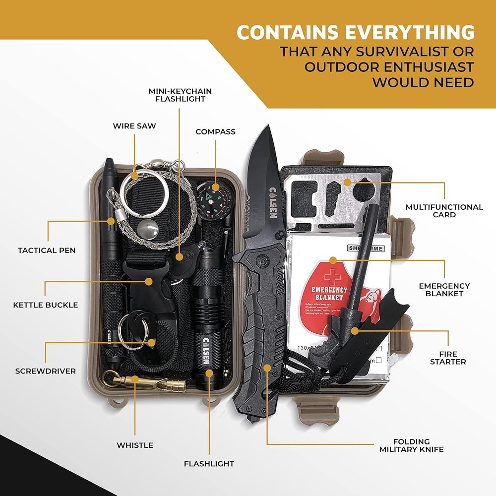 كولسن 13 في 1 مجموعة النجاة | الأدوات التكتيكية الخارجية الاحترافية | لوازم معدات الأدوات والعتاد | الملحقات الأساسية للمشي لمسافات طويلة والتخييم ومغامرات التسلق | هدايا له الزوج صديقها الرجال
