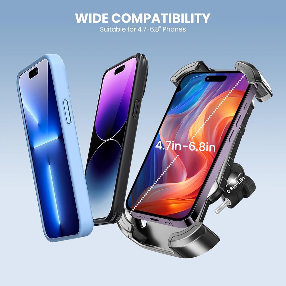 【𝐔𝐍𝐈𝐕𝐄𝐑𝐒𝐀𝐋 𝐂𝐎𝐌𝐏𝐀𝐓𝐈𝐁𝐈𝐋𝐈𝐓𝐘】: يعمل حامل هاتف الدراجة الخاص بنا مع معظم الهواتف الذكية في السوق. يمكنه حمل الهواتف بأمان بأحجام شاشات من 4.7 بوصة إلى 6.5 بوصة (بما في ذلك الحافظات).