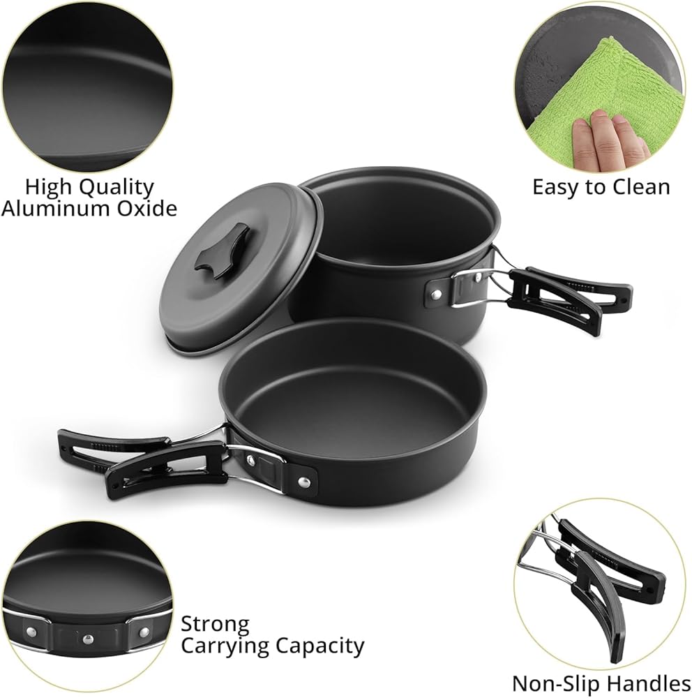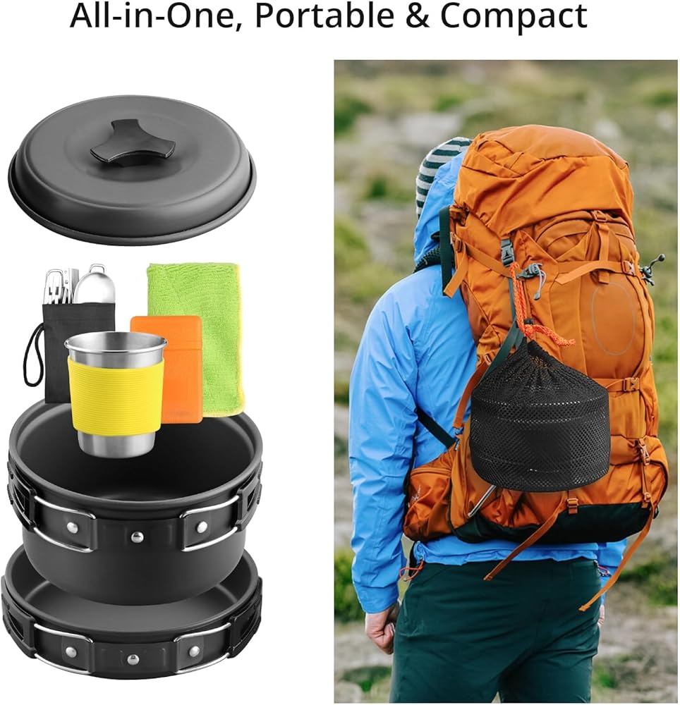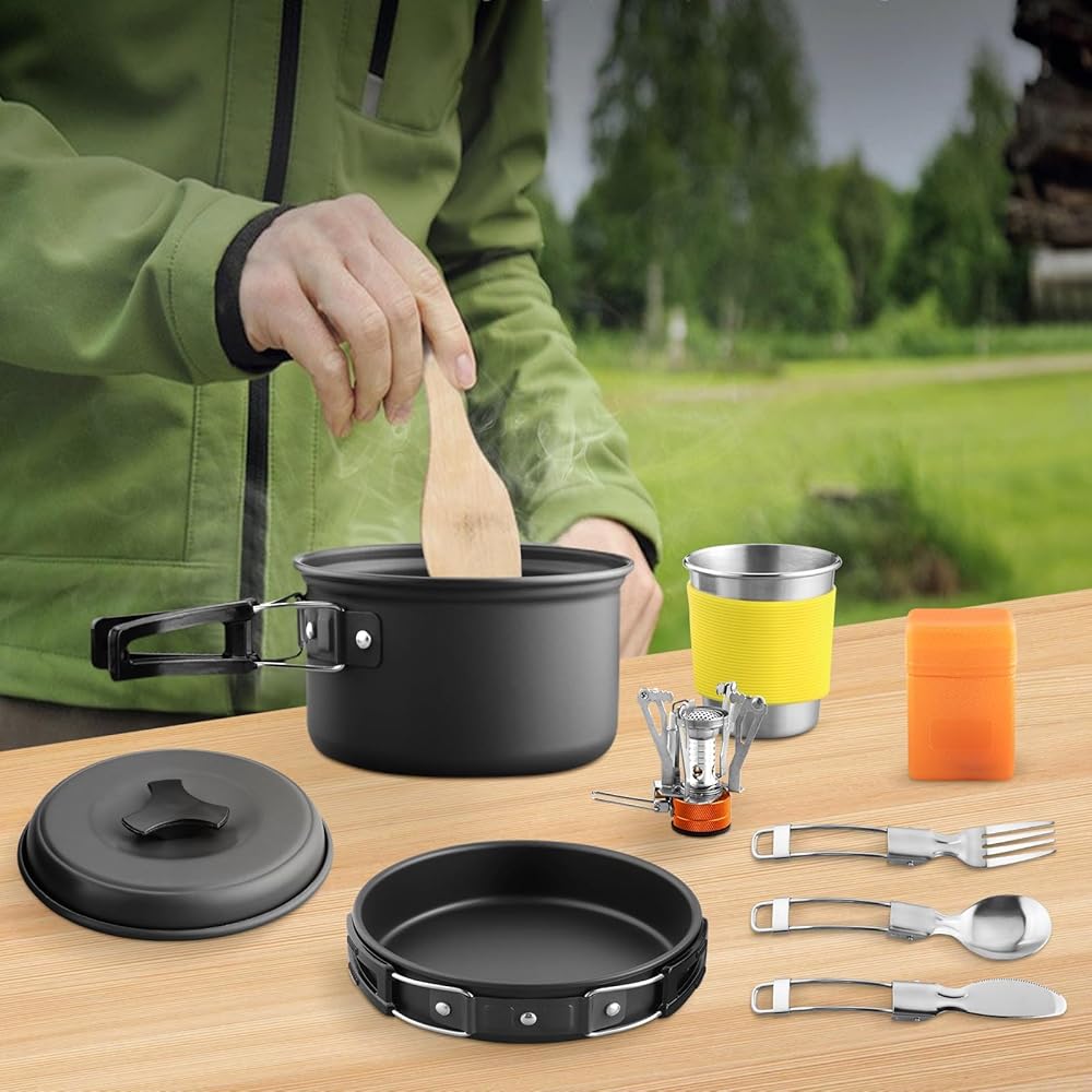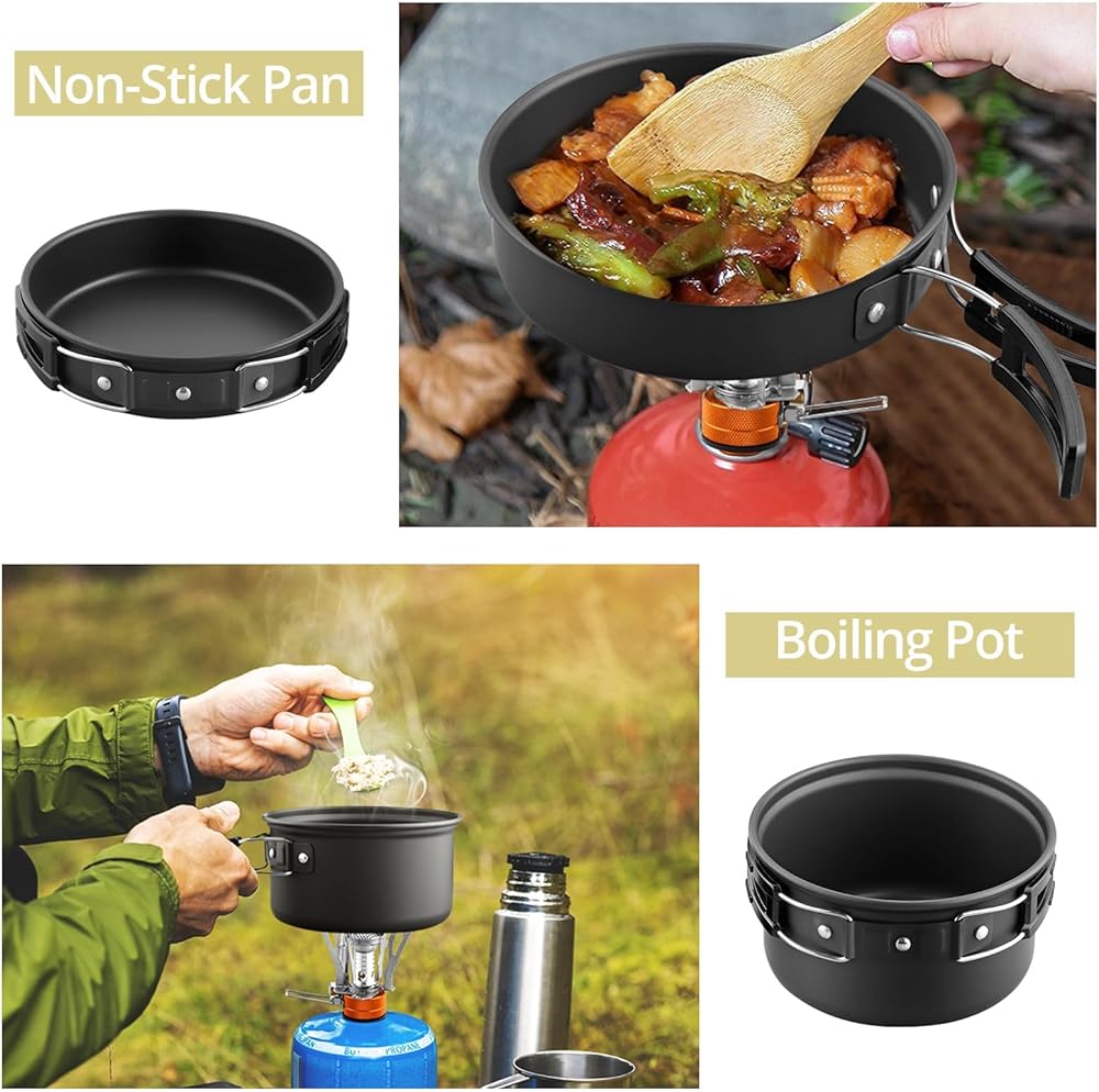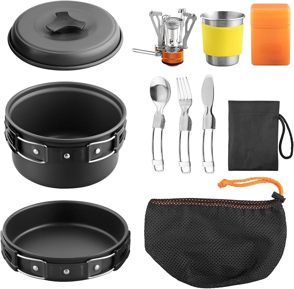 مجموعة أواني طهي للتخييم 12 قطعة، مجموعة أواني ومقالي للتخييم غير لاصقة مع موقد صغير وأدوات من الفولاذ المقاوم للصدأ، خفيفة الوزن، للتخييم، وحقائب الظهر، والطبخ في الهواء الطلق، ومجموعة فوضى التخييم لمدة 1-2