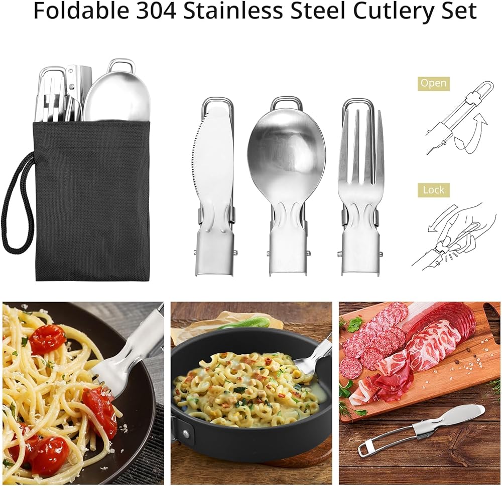 • 【موفر للمساحة وخفيف الوزن】تحتوي المقلاة على مقبض قابل للطي وسكين وشوكة وملعقة. ويمكن طي جميع العناصر في حقيبة شبكية، مما يجعلها سهلة الحمل للغاية وتوفر مساحة في حقيبة ظهرك. بوزن إجمالي يبلغ 1.34 رطل فقط، فإن مجموعة الطبخ للتخييم هذه خفيفة الوزن وقابلة للحمل للغاية.