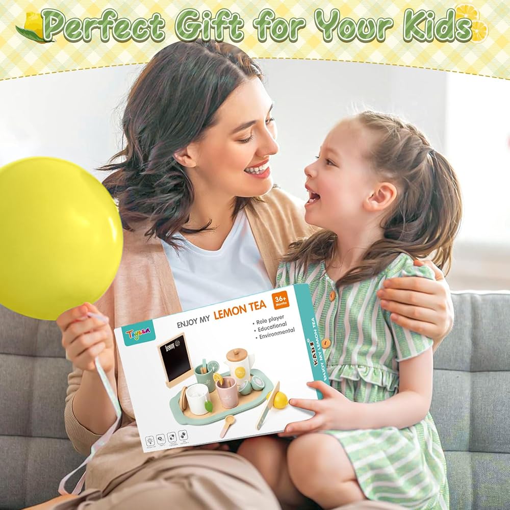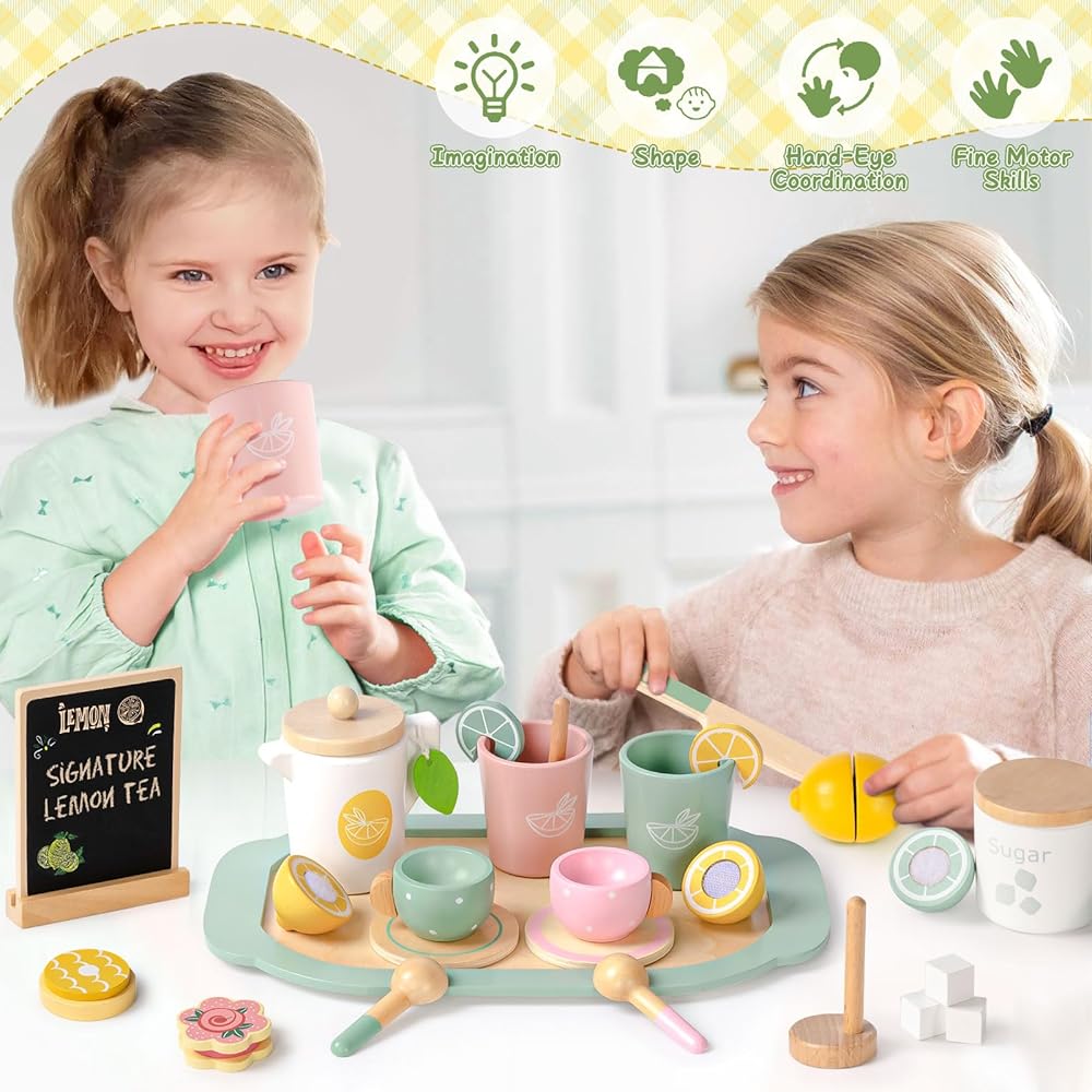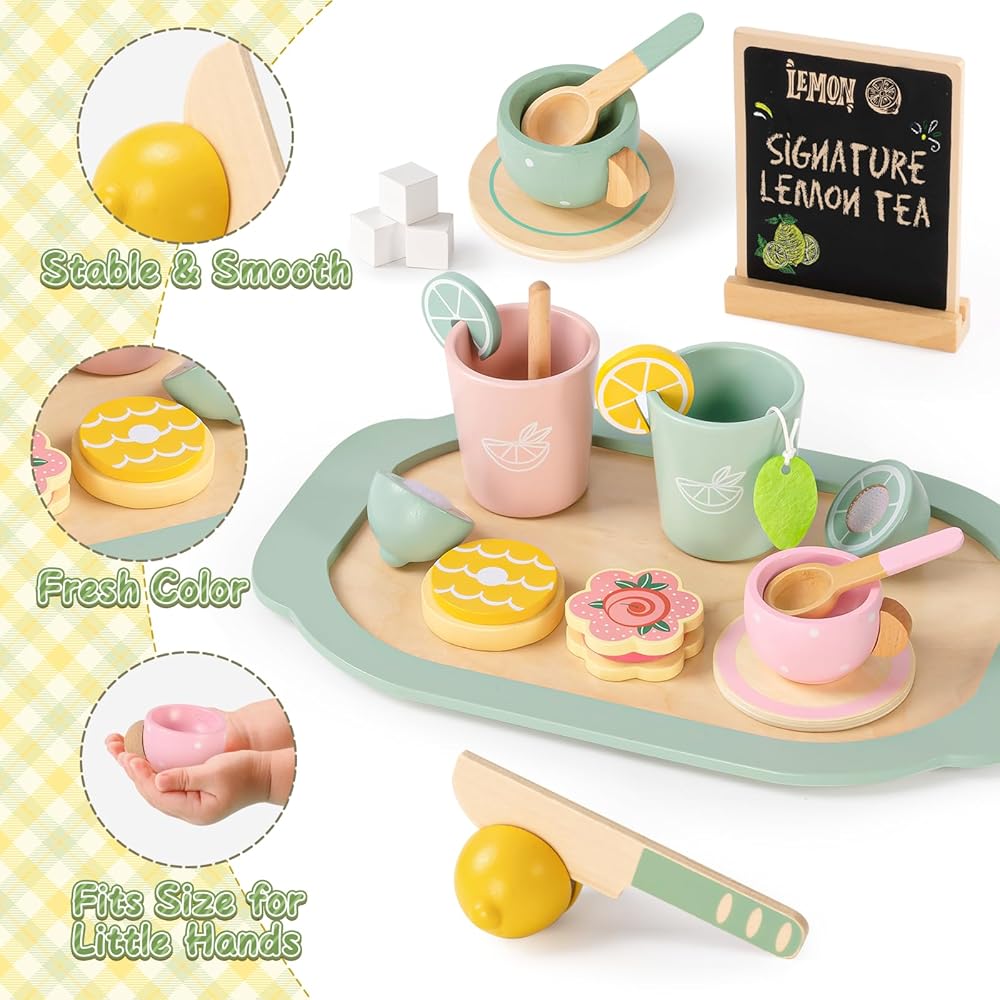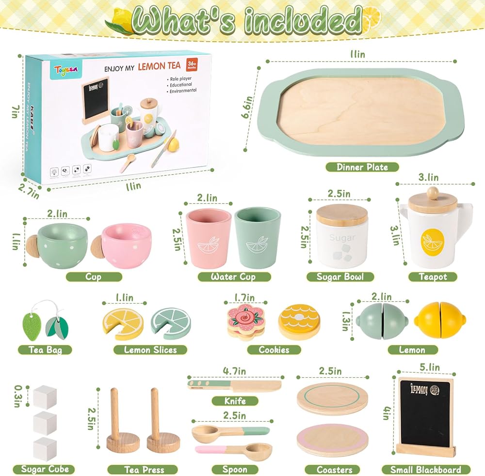 مجموعة حفلات الشاي الخشبية من تويسا للفتيات الصغيرات، مجموعة شاي للأطفال الصغار مع ملحقات مطبخ للعب وحامل عصير الليمون ولوحة سوداء، ألعاب خشبية للأطفال الصغار الذين تتراوح أعمارهم بين 2 3 4 5 6، هدايا عيد ميلاد للأطفال البنات 3+