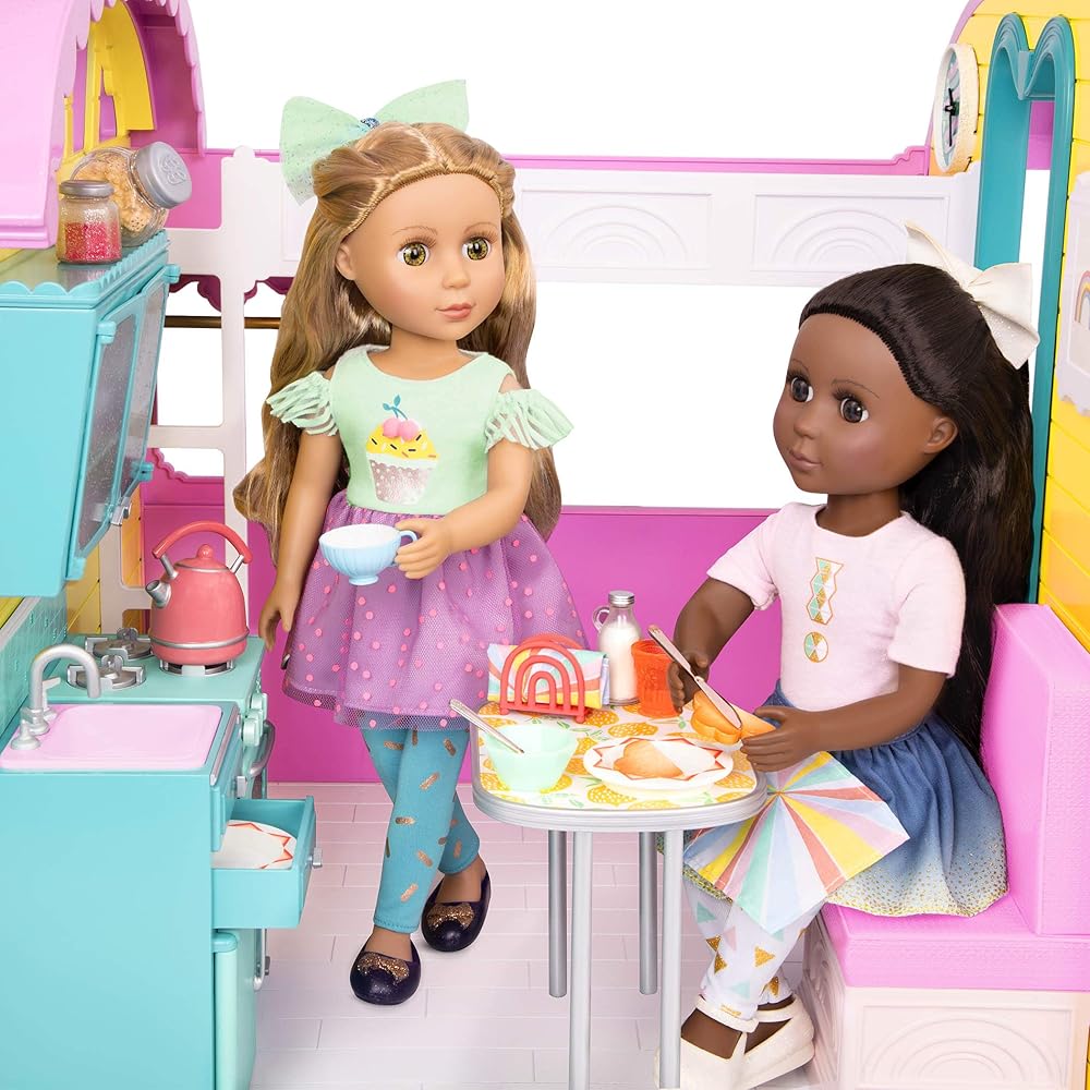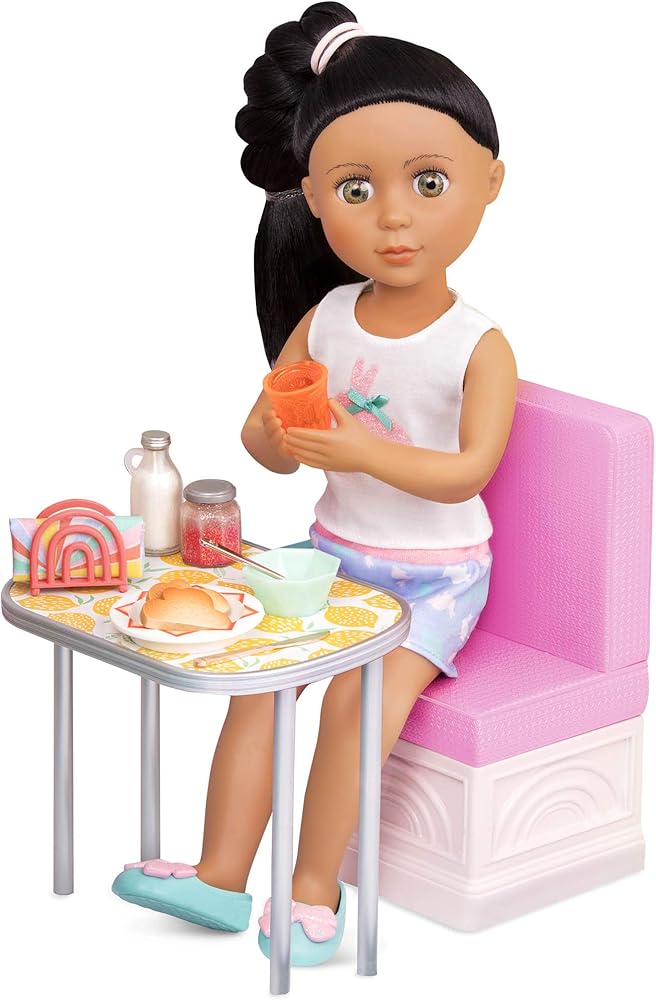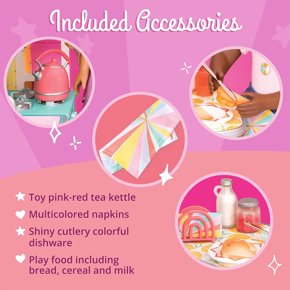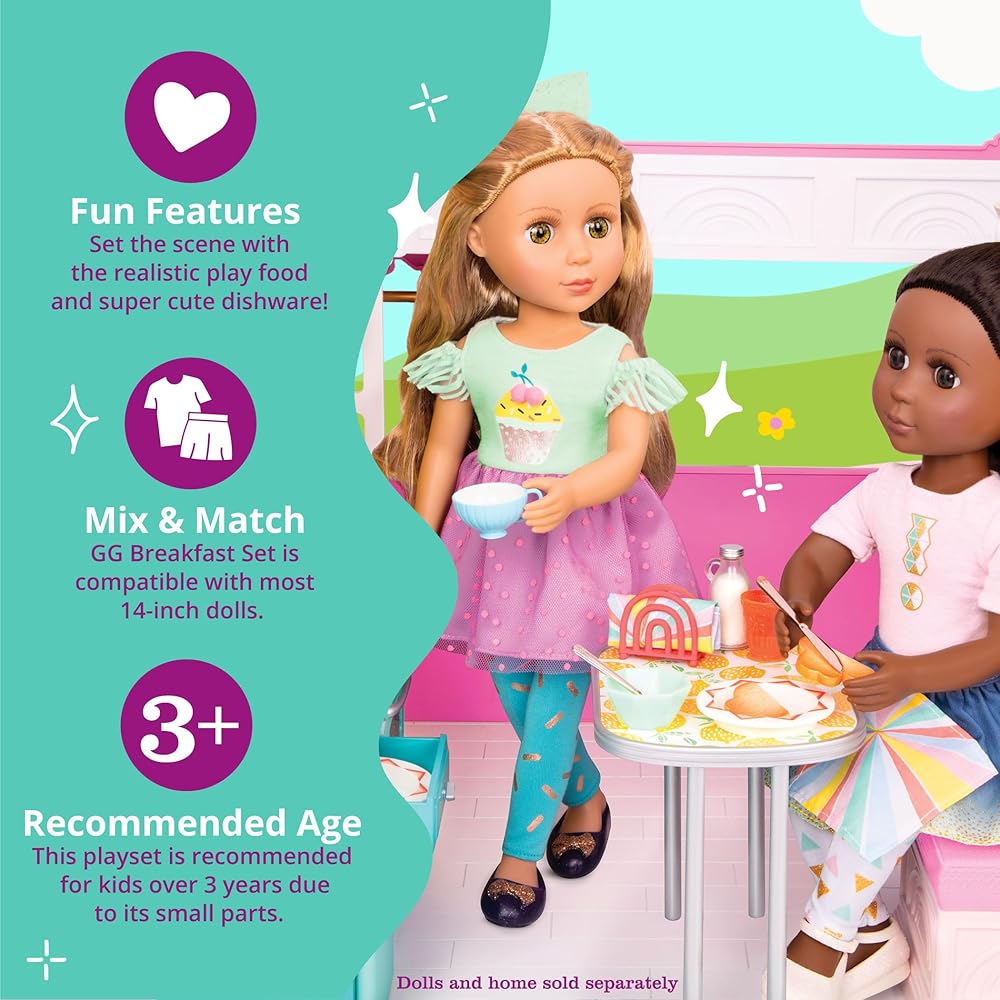 جليتر جيرلز - مجموعة إفطار دمية مقاس 14 بوصة - لعب الطعام وغلاية الشاي وإكسسوارات إعداد الطاولة - ألعاب للأطفال من سن 3 سنوات فما فوق
