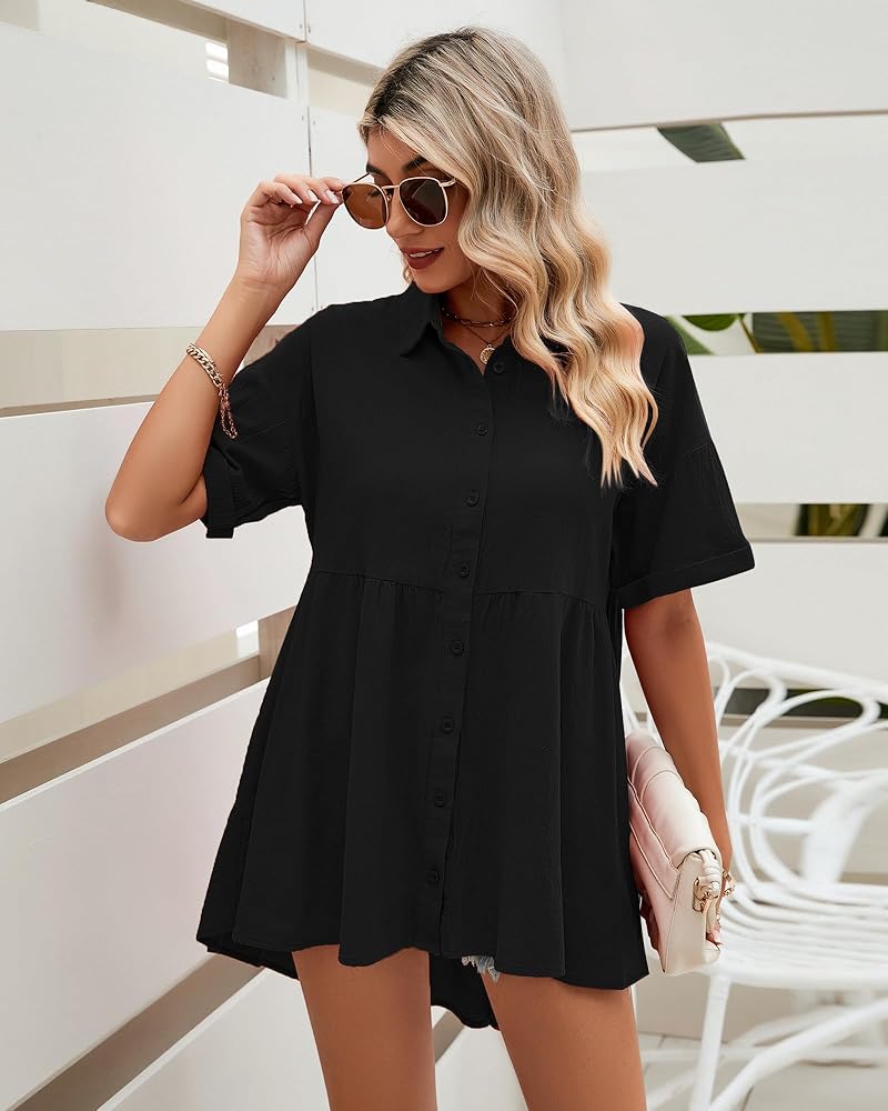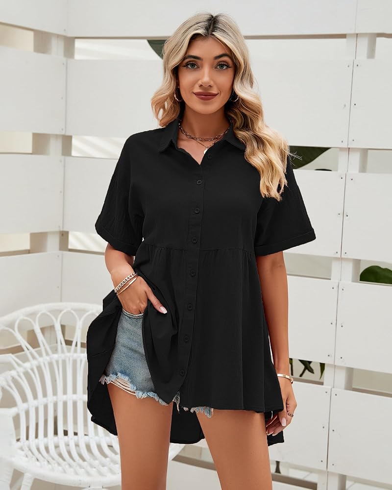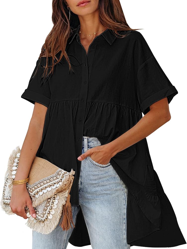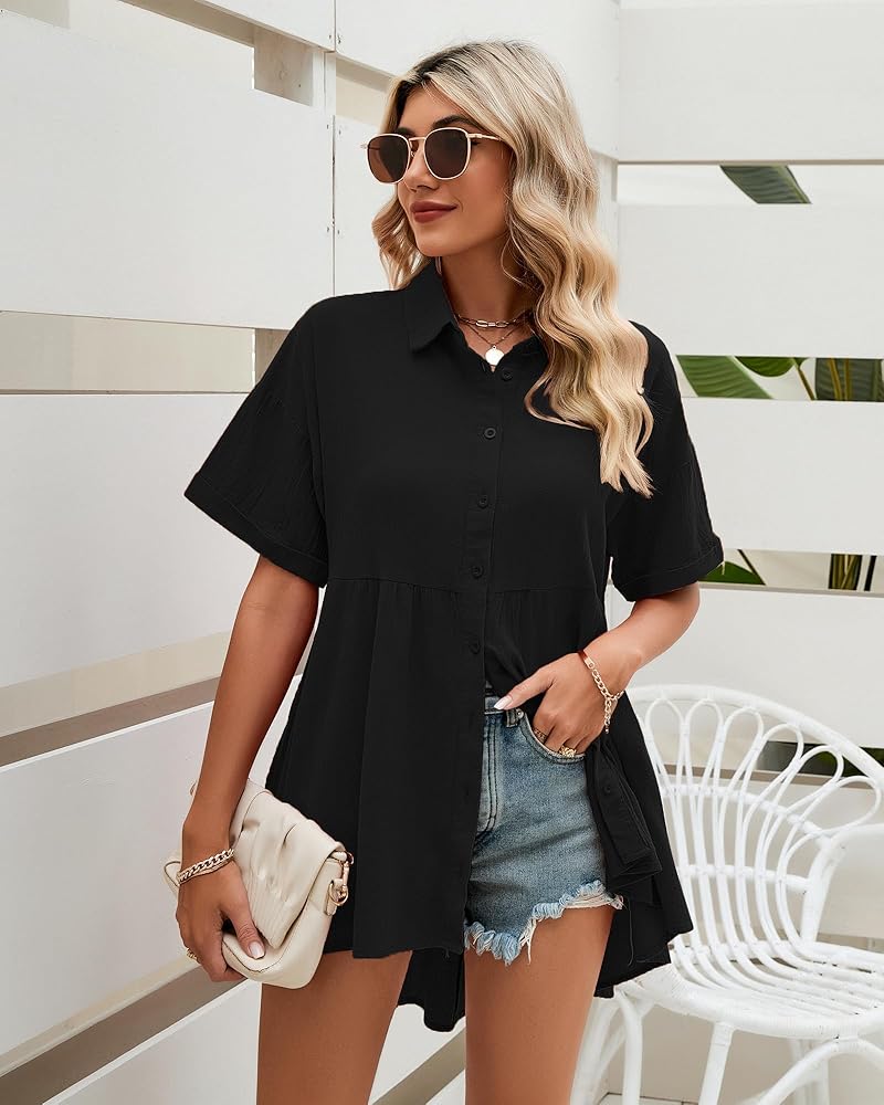 بلوزات نسائية قصيرة الأكمام مصنوعة من ياقة قميص كلاسيكية، خط رقبة على شكل حرف V، وأكمام قصيرة ملفوفة، قمصان فضفاضة للنساء، تطابق هذه القمصان الطويلة لارتدائها مع السراويل الضيقة لخلق ملابس صيفية مذهلة.