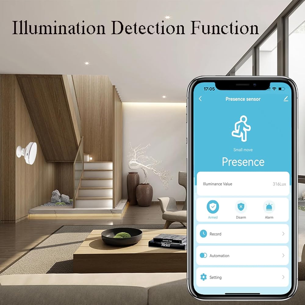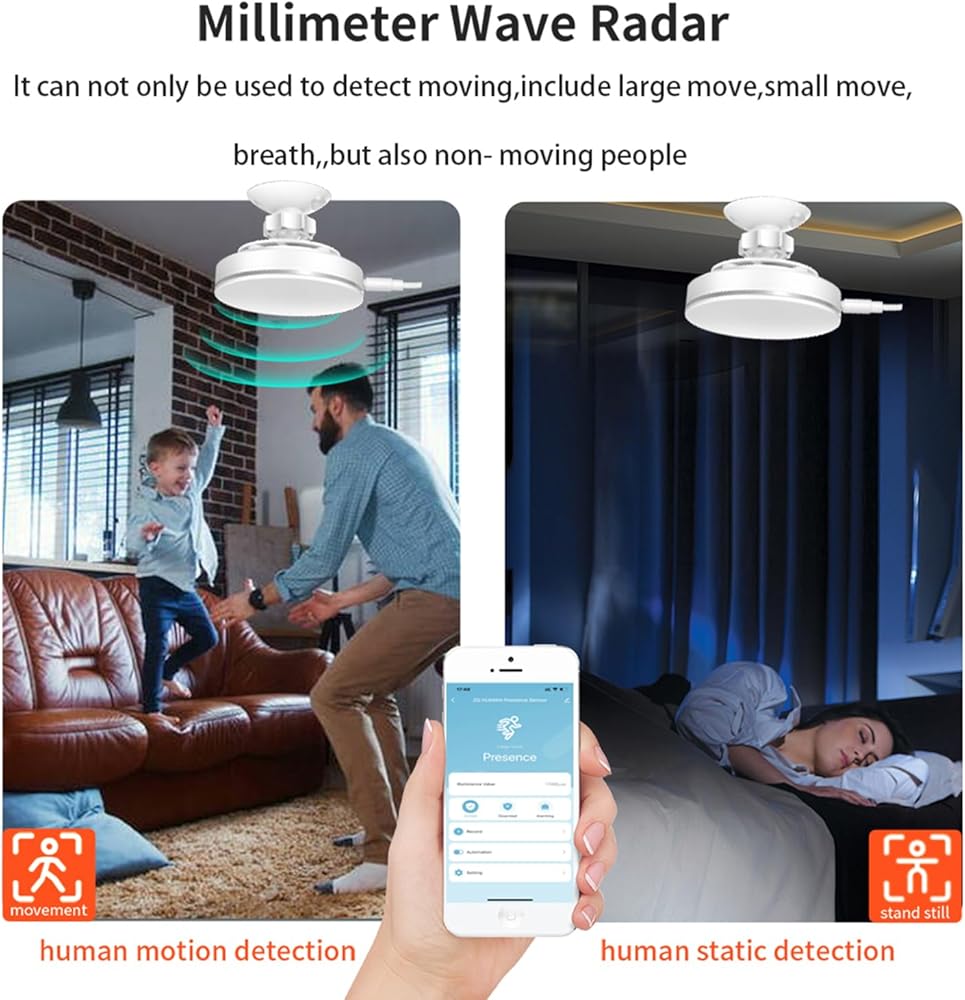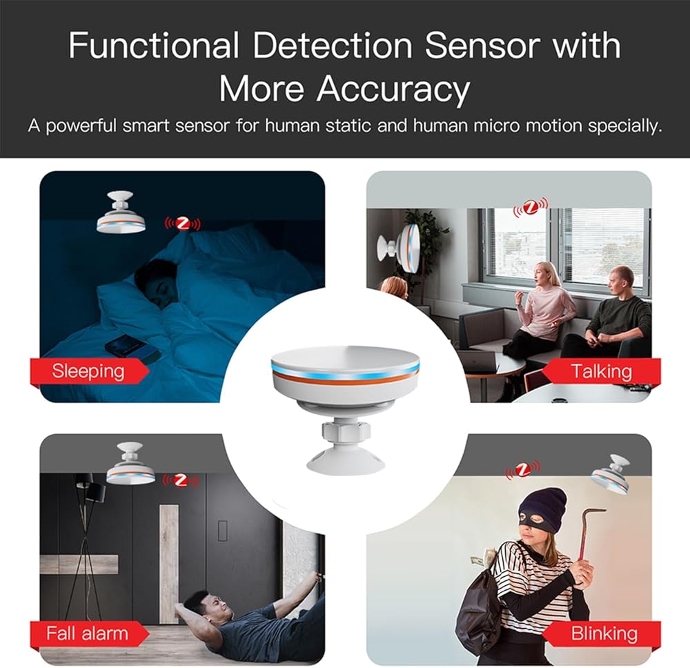 مستشعر حركة متعدد الوظائف: يعتمد مستشعر الوجود البشري واي فاي الخاص بنا على رادار موجة مليمتر، ويستشعر الحركة البشرية والوجود الثابت. يمكنه اكتشاف أصغر الحركات، حتى التنفس ونبض الحرارة. عند اكتشاف الحركة، يمكنك الحصول على إشعارات إنذار مجانية من خلال التطبيق والتحقق من سجلات التنبيه في كل مكان.