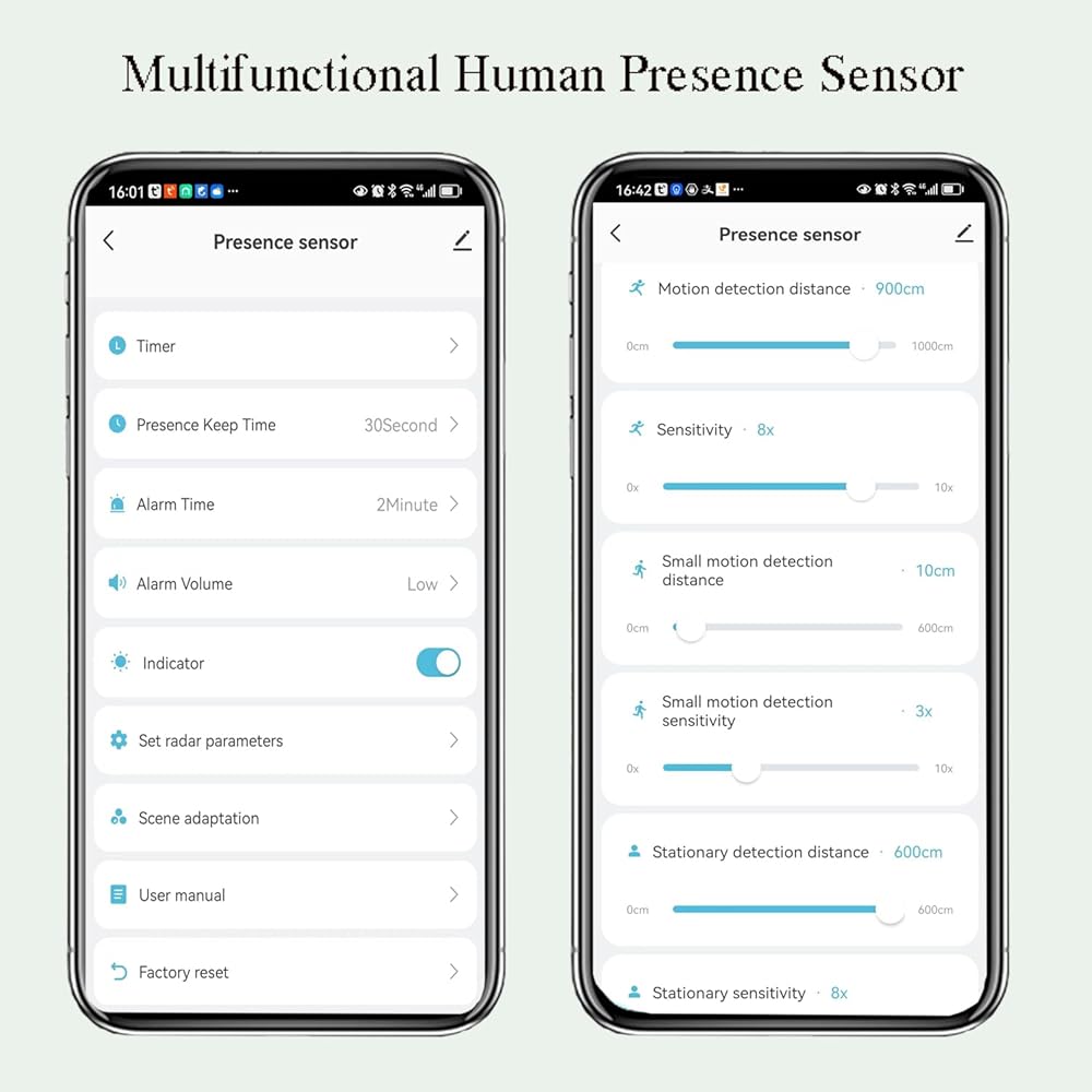تطبيق قوي وسهل الاستخدام: يوفر مستشعر الوجود مزايا كبيرة مقارنة بمستشعرات الحركة بالأشعة تحت الحمراء PIR باستخدام مستشعر رادار واحد لمراقبة الغرف التي تصل مساحتها إلى 40 مترًا مربعًا (430 قدمًا مربعًا). يمكنك ضبط الحساسية من 1-10x حسب حاجتك الخاصة، والحد الأدنى لنطاق الكشف هو 0.00 متر والحد الأقصى 10 متر لطلب الكشف المرن. وفي الوقت نفسه، تم تصميم مستشعر الحركة الذكي مع ضبط وقت الانتظار على 0-1500 ثانية ووقت استجابة الكشف على 0 -10 ثواني لتجنب الحركة المزعجة غير ذات الصلة وتقليل معدل الإنذار الكاذب.