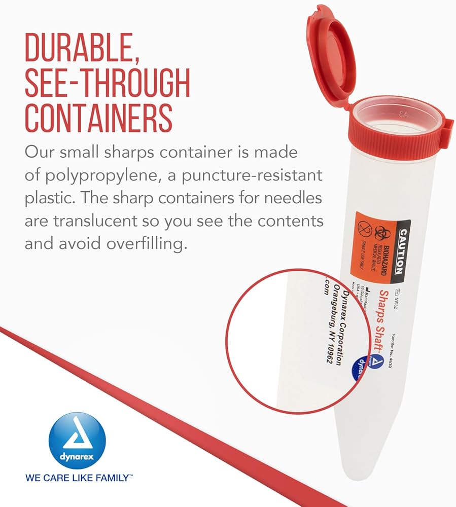 • حاويات متينة وشفافة - حاوية الأدوات الحادة الصغيرة الخاصة بنا مصنوعة من مادة البولي بروبيلين، وهو بلاستيك مقاوم للثقب. تتميز الحاويات الحادة للإبر بأنها شفافة حتى تتمكن من رؤية المحتويات وتجنب الإفراط في ملئها