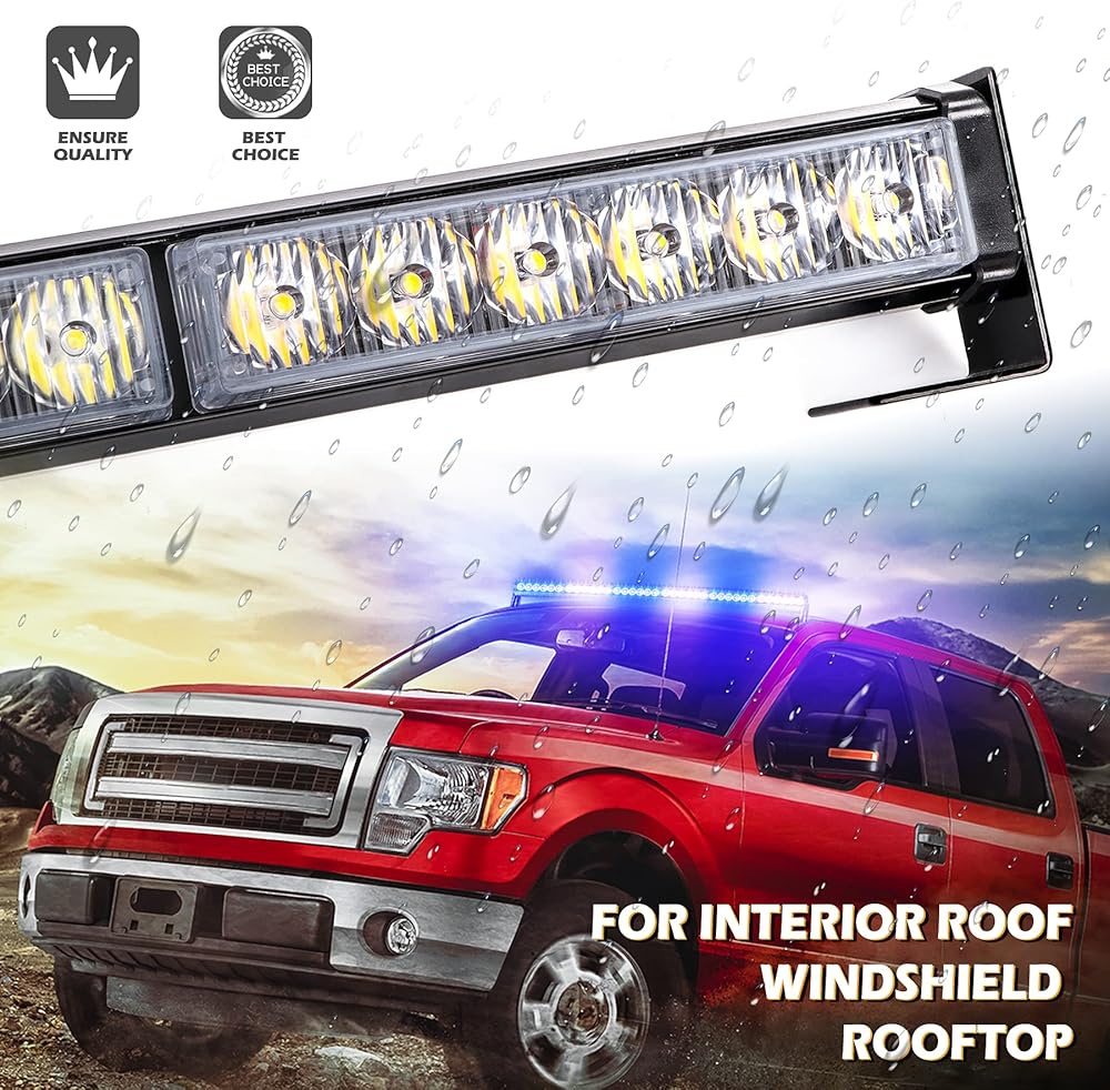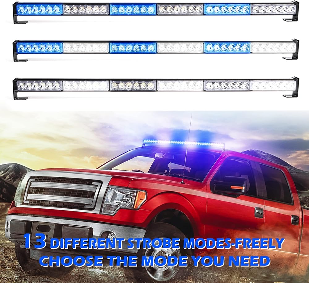 شريط إضاءة ستروب للطوارئ 36 بوصة 36 LED 16 وضعًا وامضًا فائق السطوع وغطاء من الألومنيوم المقاوم للماء وقوس قابل للتعديل ضوء الطوارئ للسيارات والشاحنات والمركبات، أزرق وأبيض