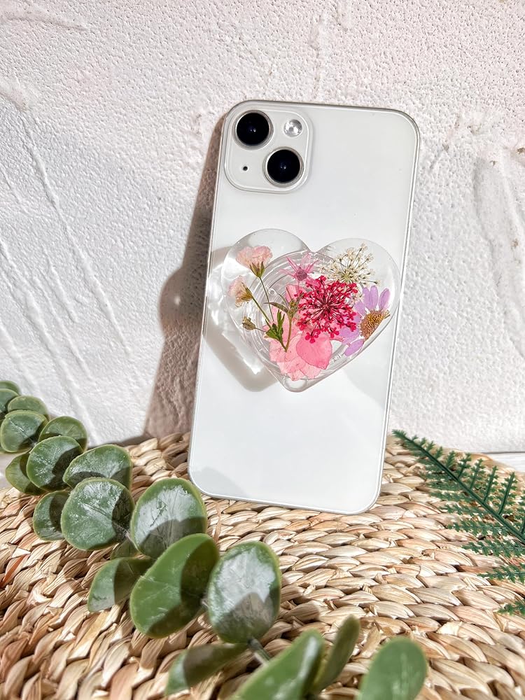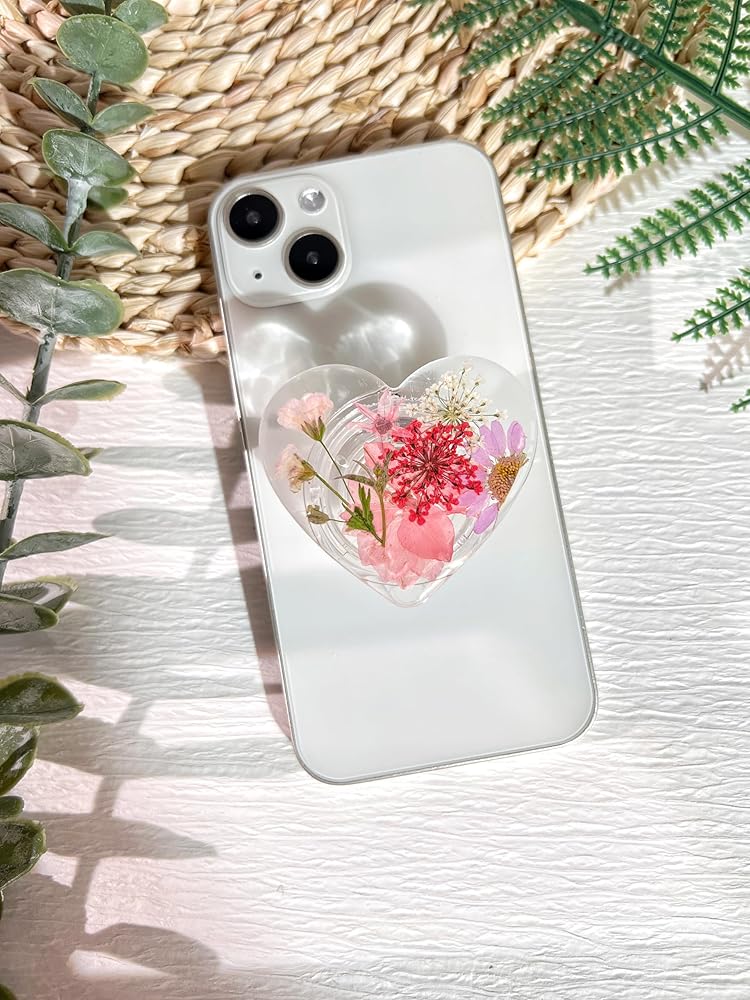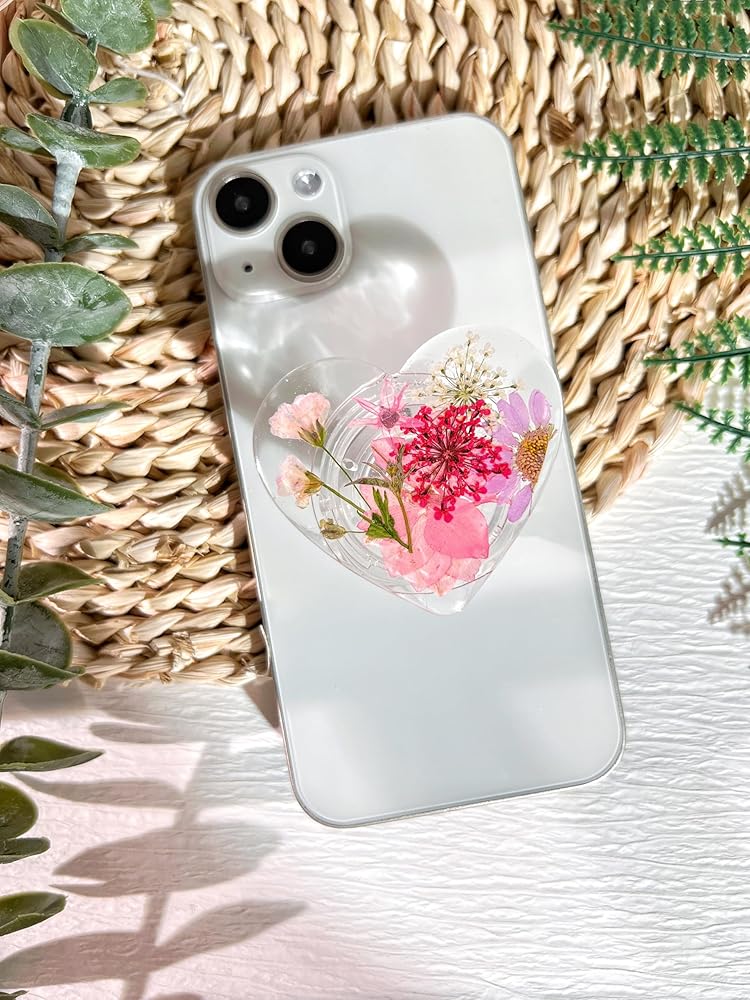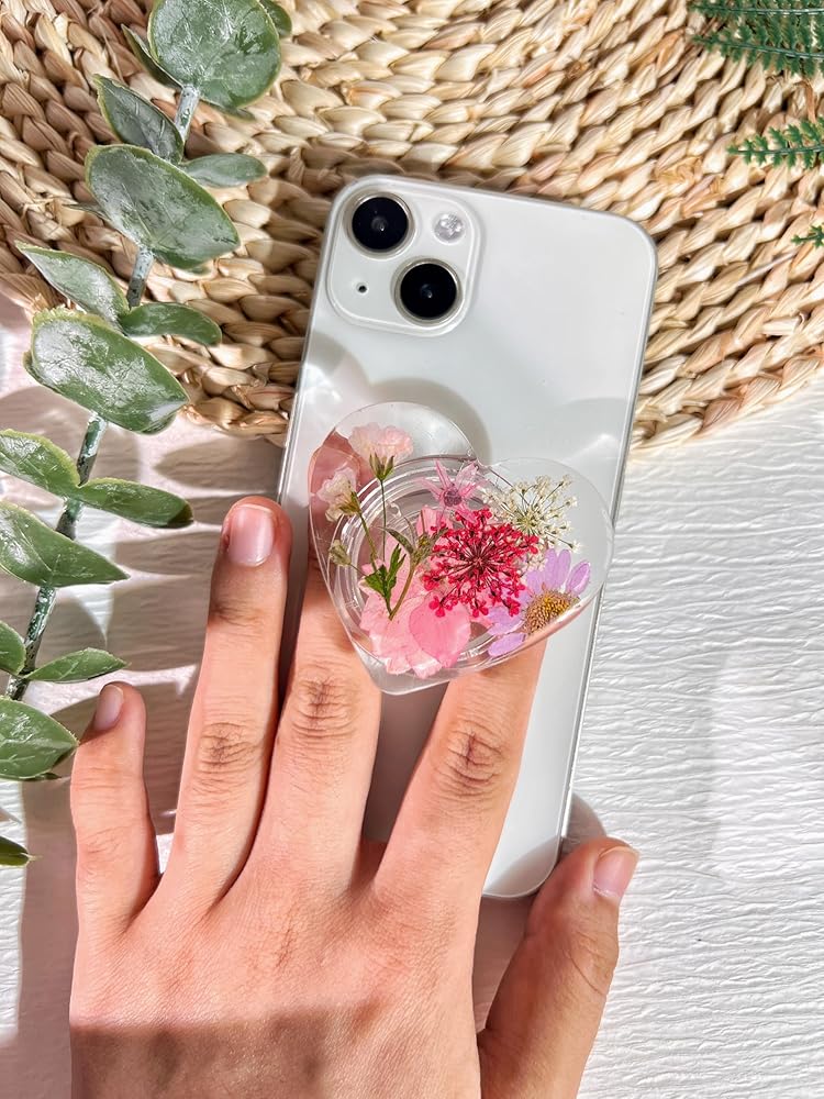 حامل قبضة الهاتف على شكل زهور وردية مضغوطة، ملحق هاتف خلوي شفاف قابل للطي وقابل للتوسيع مصنوع يدويًا، حامل هاتف من الزهور الطبيعية المجففة، دعم الهاتف اللوحي