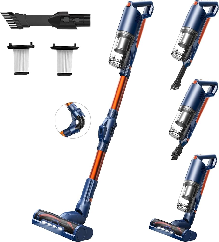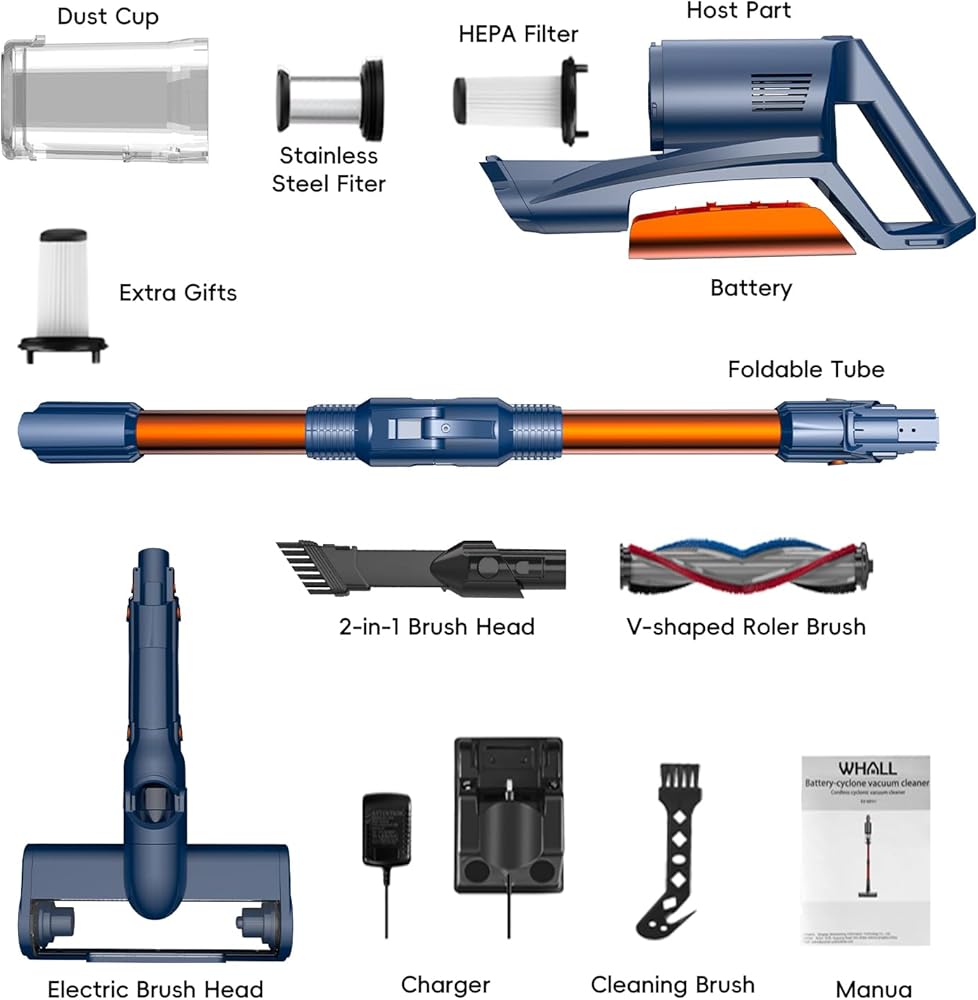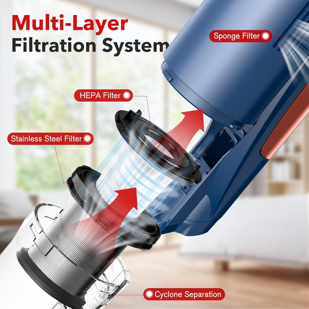 💎【نظام ترشيح فعال من 4 طبقات】 تقنية الإعصار جنبًا إلى جنب مع فلتر عالي الكثافة في المكنسة الكهربائية اللاسلكية تنظف ما يصل إلى 99.99% من الغبار والجسيمات الدقيقة وتمنع تلوث الهواء الثانوي، مما يوفر لك تجربة تنظيف ممتازة. ملحوظة: يمكن غسل الفلتر وفصله ويوجد فلتر إضافي هدية.