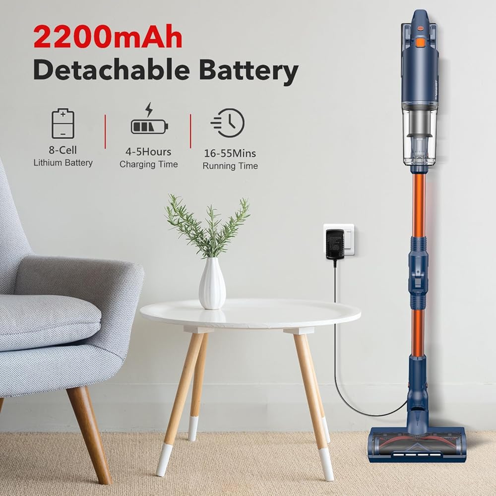مكنسة كهربائية لاسلكية، مكنسة كهربائية مطورة بقوة 25 كيلو باسكال، قوة شفط 280 وات، محرك بدون فرشاة، مكنسة كهربائية محمولة خفيفة الوزن للسجاد المنزلي وشعر الحيوانات الأليفة، وقت تشغيل يصل إلى 55 دقيقة