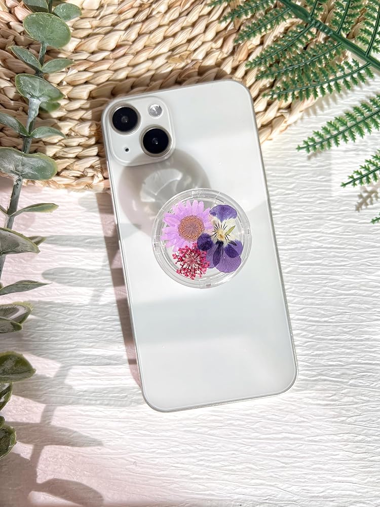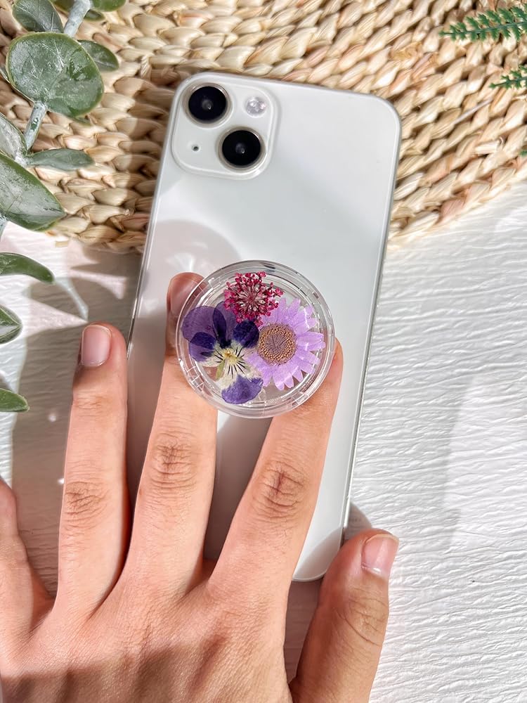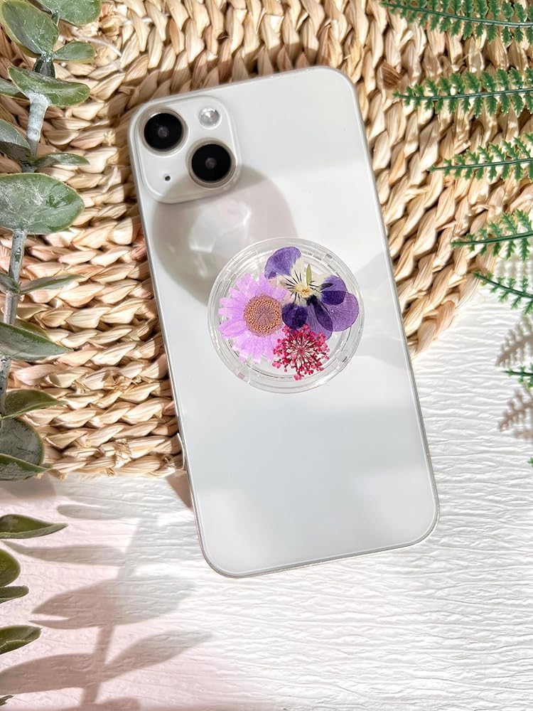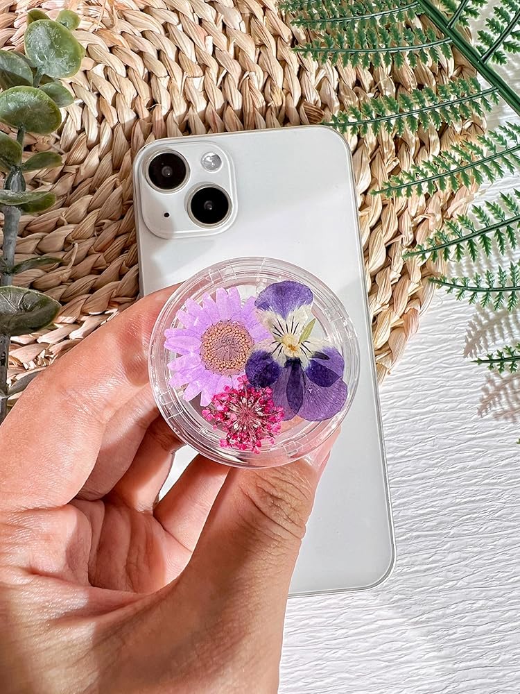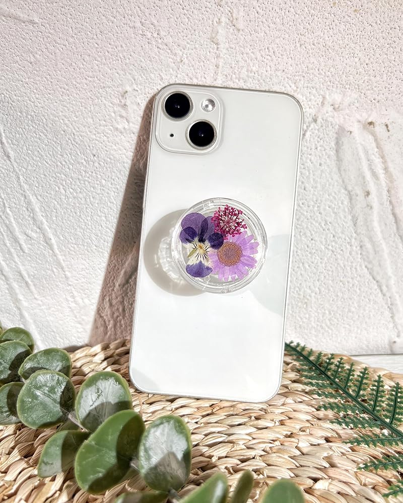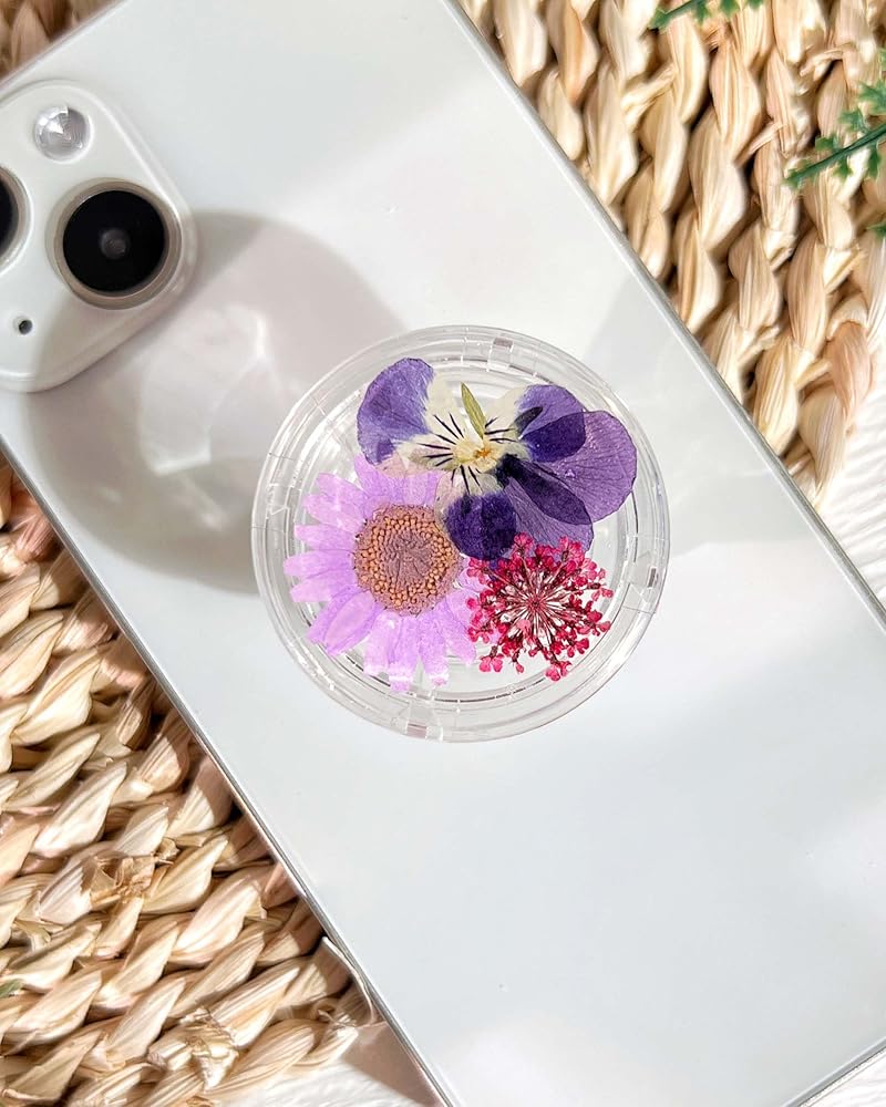 حامل قبضة الهاتف على شكل زهور أرجوانية مضغوطة، ملحق هاتف خلوي شفاف قابل للطي وقابل للتوسيع مصنوع يدويًا، حامل هاتف من الزهور الطبيعية المجففة، دعم الهاتف اللوحي