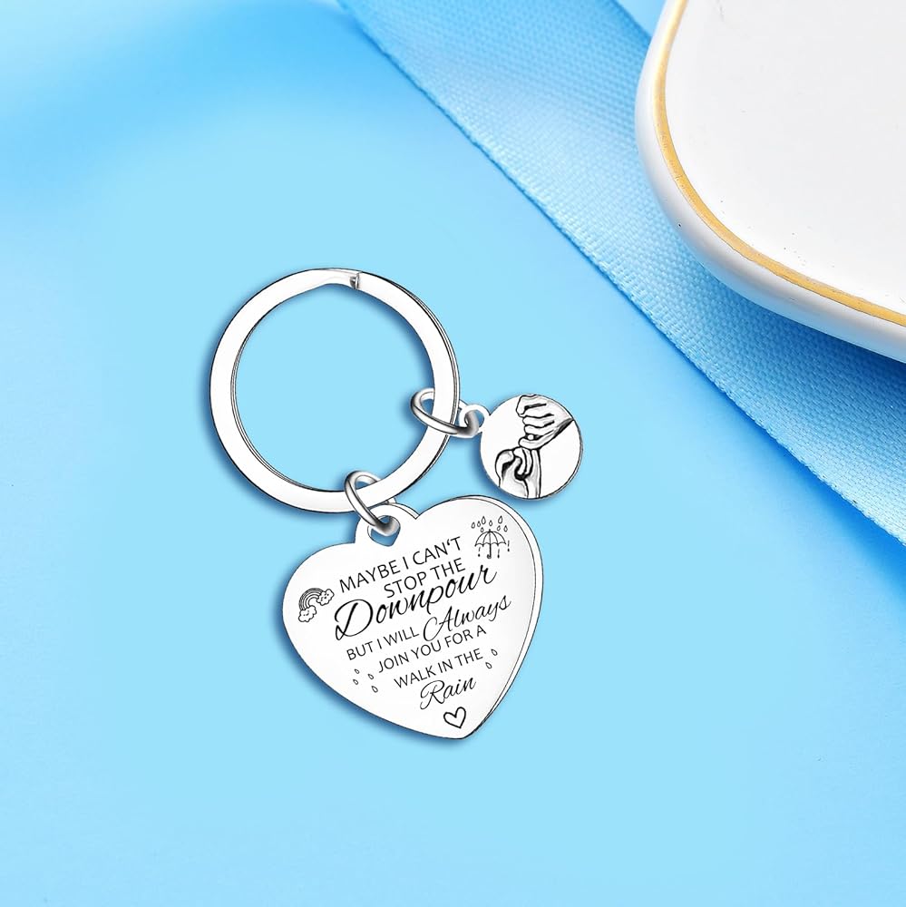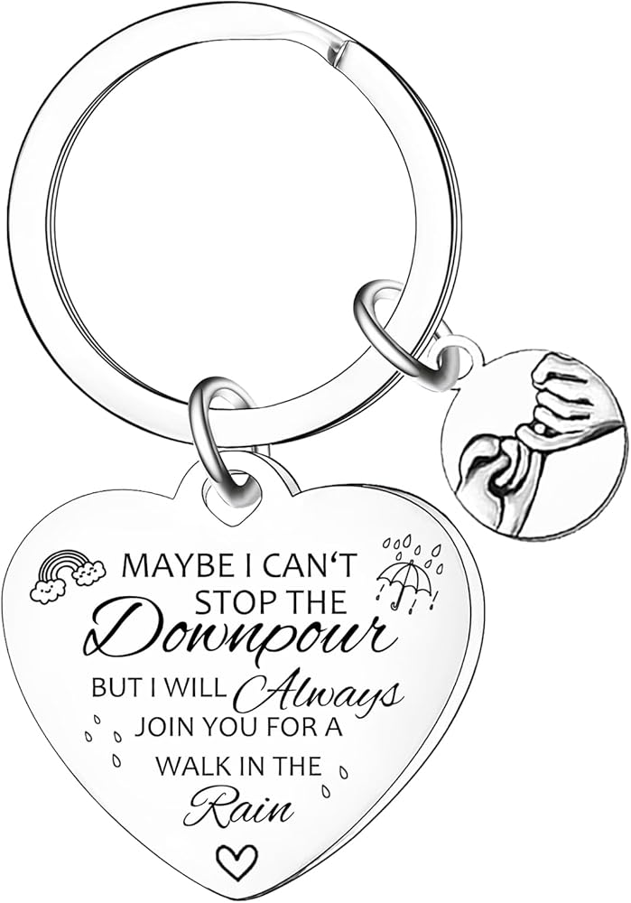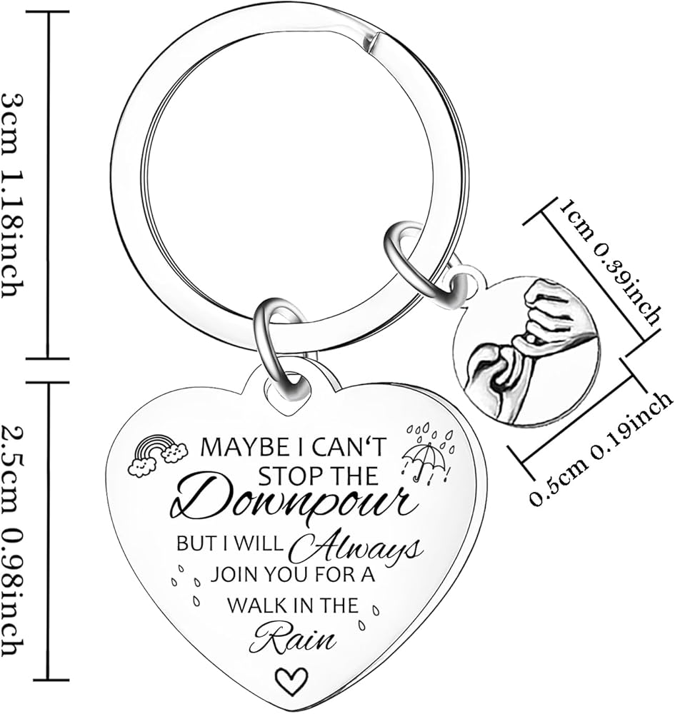 💖سلسلة مفاتيح مرحة لأفضل صديق: سلسلة مفاتيح الصداقة على شكل قلب منقوشة بكلمات "ربما لا أستطيع إيقاف هطول الأمطار". إنه تذكير بأنك ستكون موجودًا دائمًا من أجلهم، بغض النظر عن الظروف.