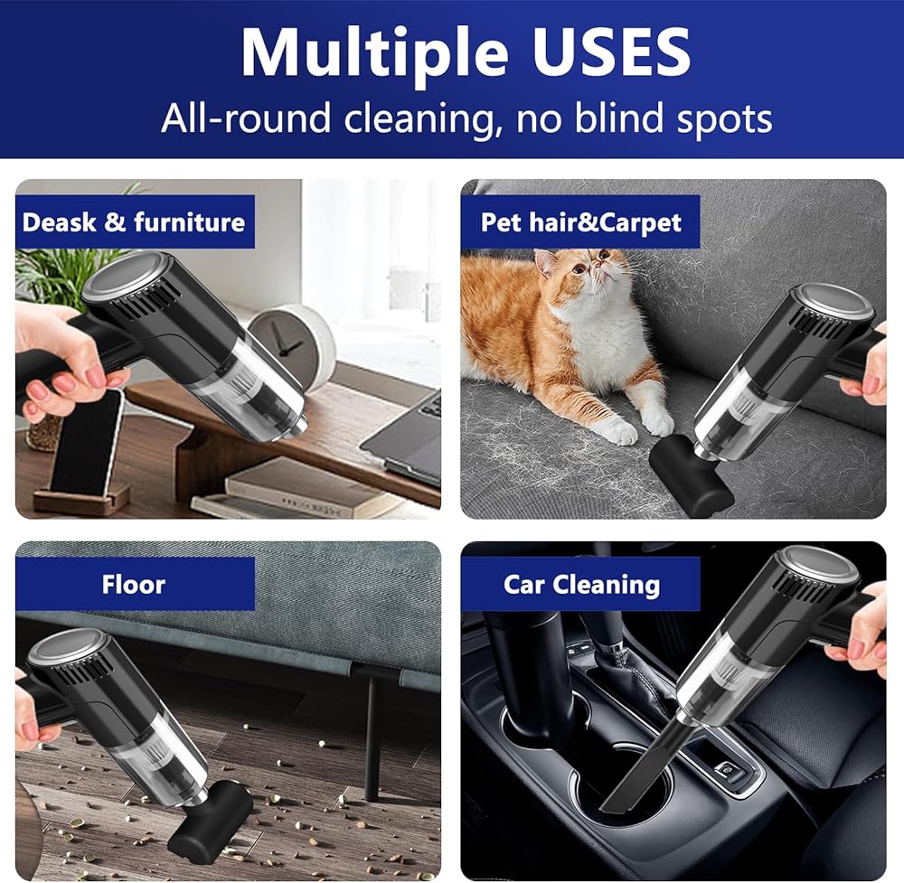 مكنسة كهربائية متعددة الوظائف: مكنسة كهربائية احترافية لاسلكية محمولة باليد، تجعل سيارتك ومنزلك نظيفين كل يوم. تتميز المكنسة الكهربائية المحمولة بجسم خفيف الوزن حيث يصل وزنها إلى 0.65 كجم فقط. ليس من المتعب الاحتفاظ به لفترة طويلة وهو مناسب بشكل خاص لكبار السن والنساء. إذا لم تكن راضيًا عن عملية الشراء، فيرجى الاتصال بنا. سوف نقوم بالرد وتقديم الخدمة لكل عميل في غضون 24 ساعة