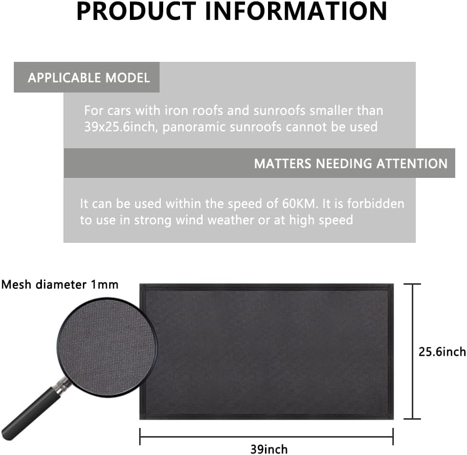 【التطبيق: 1 × فتحة سقف شبكية، الحجم: 39 × 25.6 بوصة. مناسبة لمعظم السيارات، وسيارات الدفع الرباعي الصغيرة، وسيارات الكروس أوفر، وسيارات الدفع الرباعي الكبيرة، والشاحنات، وما إلى ذلك. مع حجم فتحة السقف في حدود 35 × 20 بوصة. ملحوظة: فتحة السقف البانورامية غير متوفرة، ويمكن استخدامها في حدود سرعة 60 كيلومترًا؛ لا تستخدم في الطقس العاصف القوي أو القيادة بسرعة عالية.