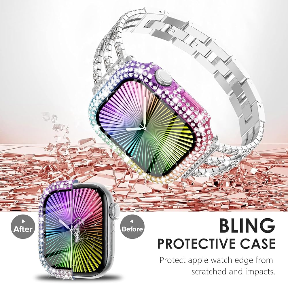 4 عبوات من CHANCHY متوافقة مع حافظة Apple Watch Series 10 مقاس 42 مم مع واقي شاشة، غطاء حماية من الألماس الكريستالي 300 لساعة Apple 10، أسود/فضي/قوس قزح/شفاف، 42 مم