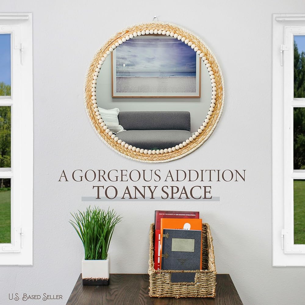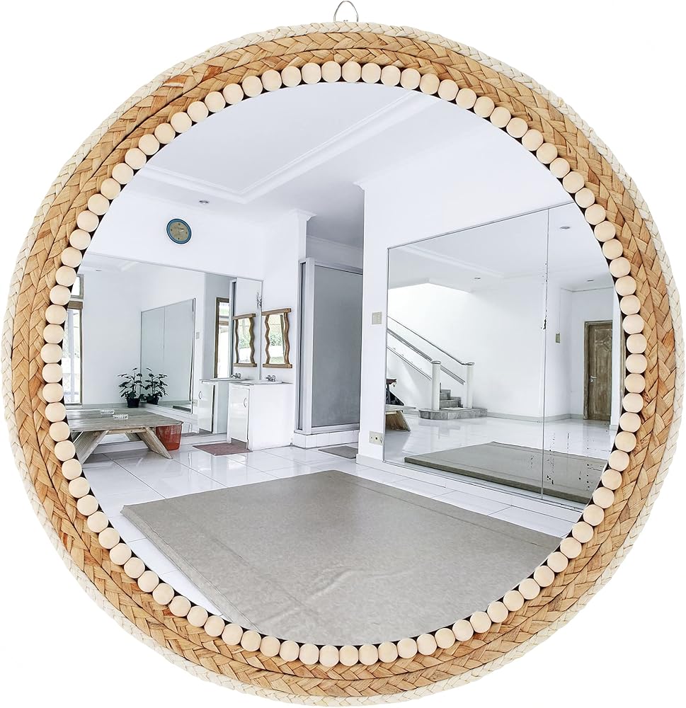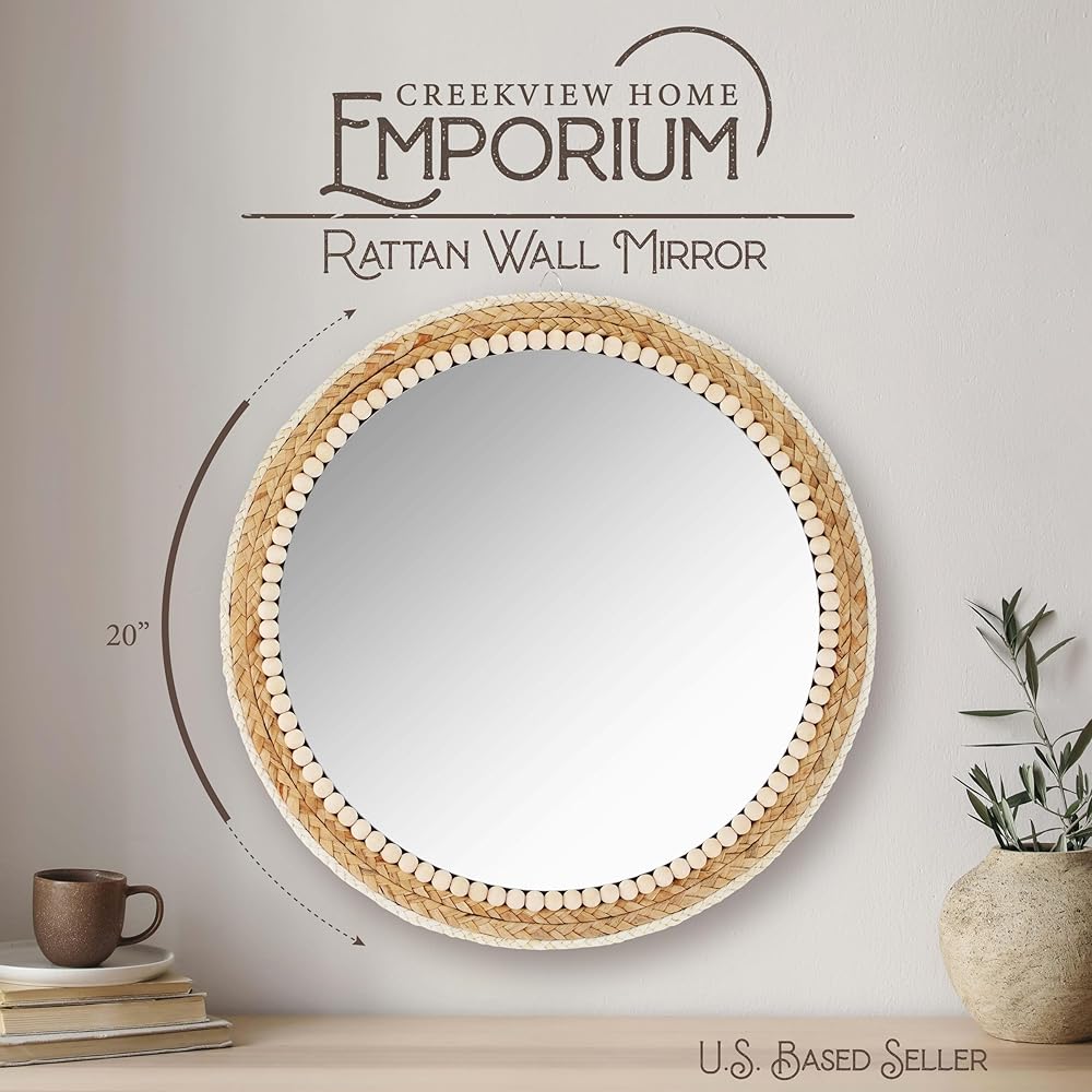 ديكور حائط مرآة المزرعة - دائرة مرآة من الروطان معلقة مقاس 20 بوصة - ديكور مرآة بوهو ريفي للحمام وغرفة النوم والحضانة والمدخل