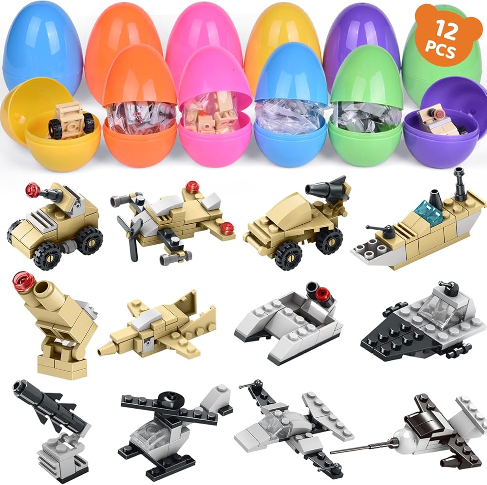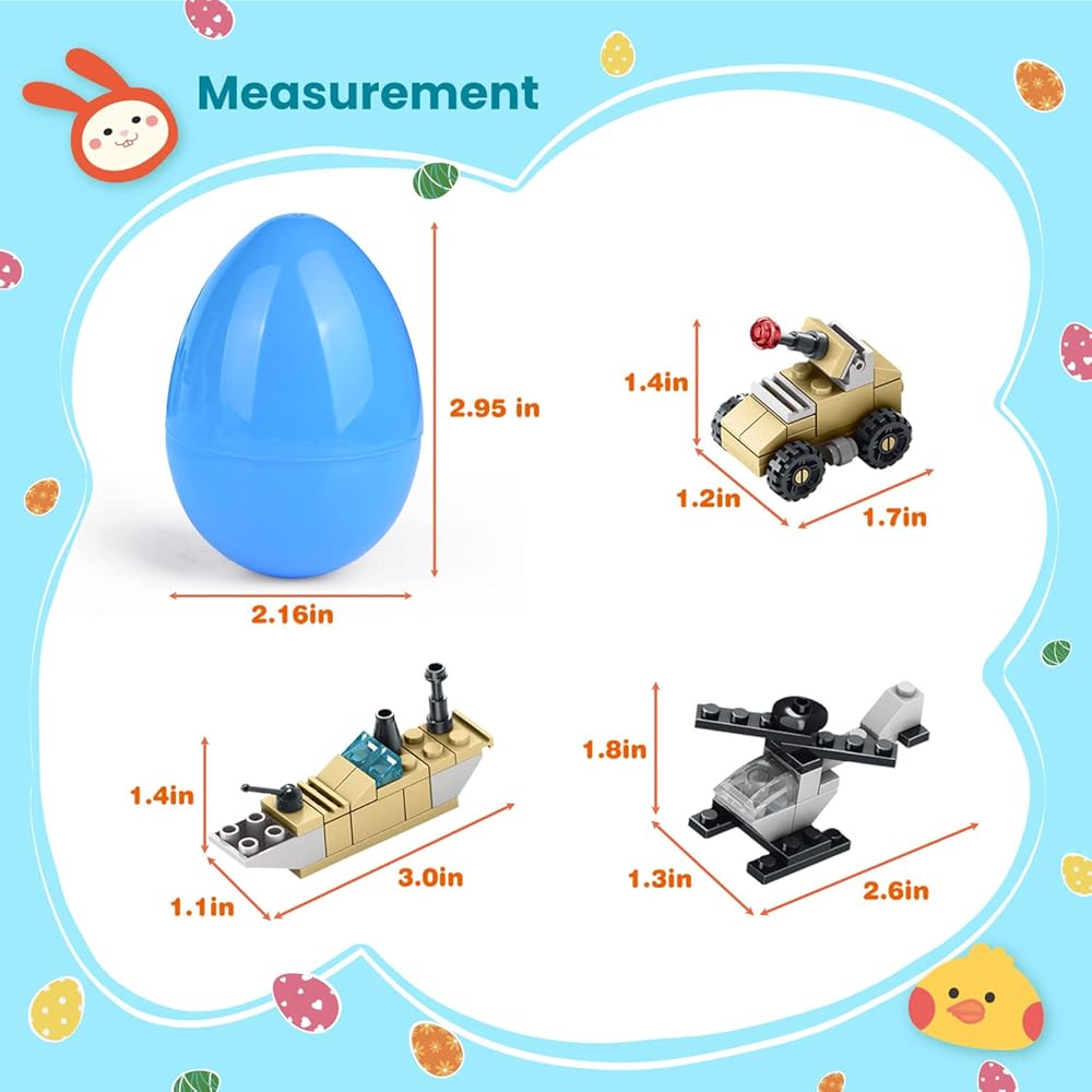 تحتوي المجموعة على دستة (12) بيضة مع 12 قطعة بناء مركبة عسكرية متنوعة؛ يبلغ مقاسها 2.76 بوصة طولًا × 1.97 بوصة قطرًا.