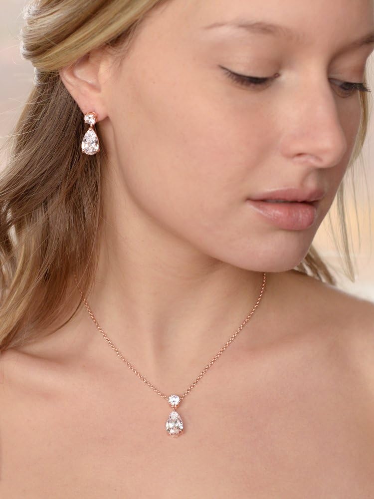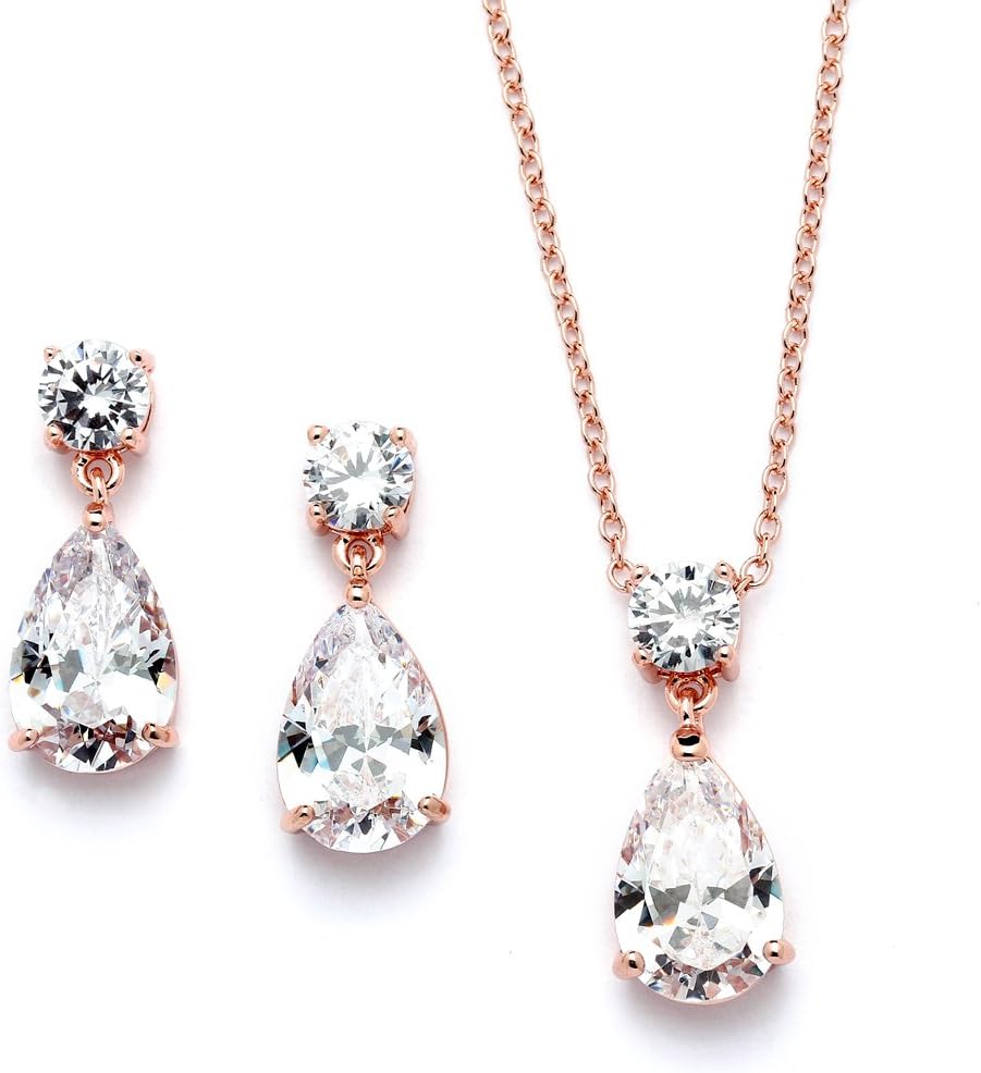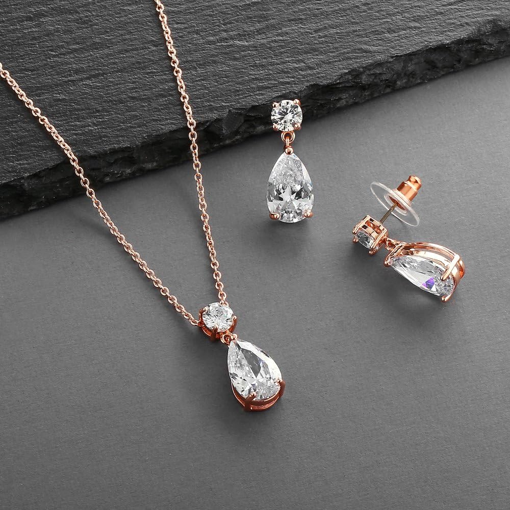 نمط فاخر: مجموعة أقراط قلادة من الزركونيا المكعبة من الذهب الوردي من Mariell مع دموع رائعة على شكل كمثرى، أضف بريق أحمر الخدود المتطور إلى حفل الزفاف الخاص بك، أو الحفلات الراقصة، أو وصيفات العروس، أو حفلات الزفاف، أو أم العروس أو المناسبات الخاصة