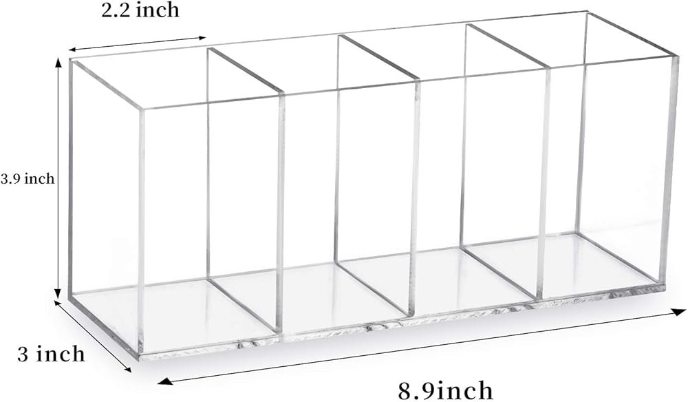 < المقاس > 9 بوصة طول × 3 بوصة عرض × 3.9 بوصة ارتفاع × 0.12 بوصة ثك. اللون: واضح. المادة: 100% أكريليك. الاستخدام: حامل أقلام الرصاص، منظم القلم للمكتب في المكتب والمدرسة، منظم فرش المكياج، تخزين فرش مستحضرات التجميل