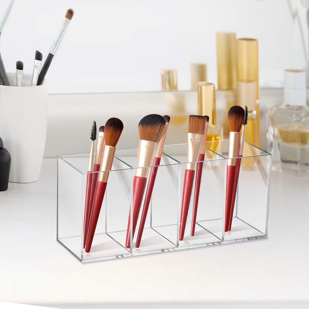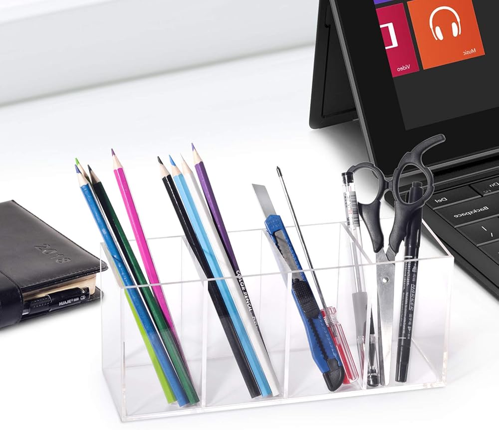 <مقصورات مقسمة > يمكن لمنظم أقلام الأكريليك مع 4 أقسام مقسمة فرز الأقلام والأقلام الرصاص وأقلام التلوين ومنظم فرش الطلاء وغيرها من لوازم المكتب المكتبية في مساحات مختلفة، والحفاظ على منظم اللوازم المكتبية الخاص بك وسهل العثور عليه.