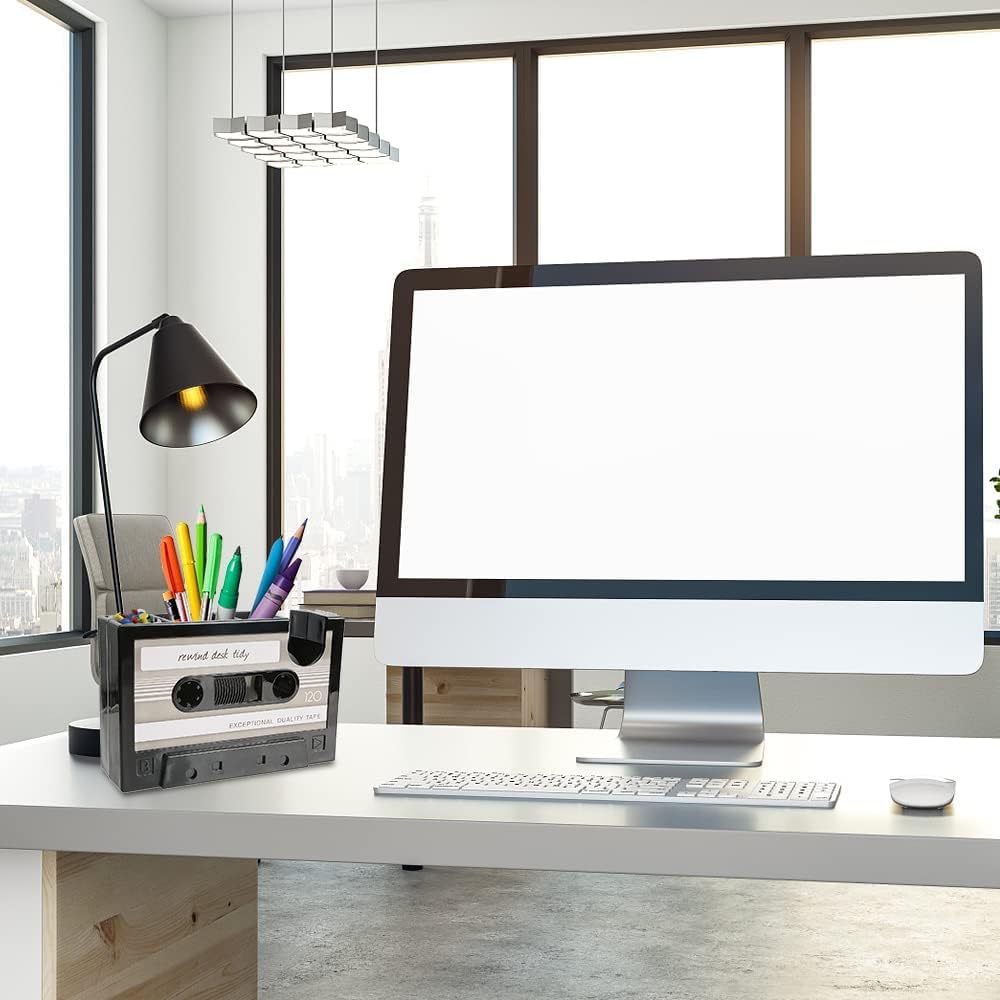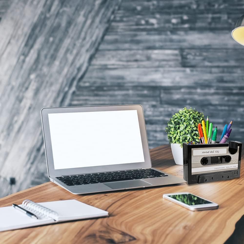 • تصميم شريط كاسيت قديم يجعل حامل القلم هذا ملفتًا للنظر حقًا، ويضيف لمسة لطيفة من الألوان والمرح إلى المكتب.