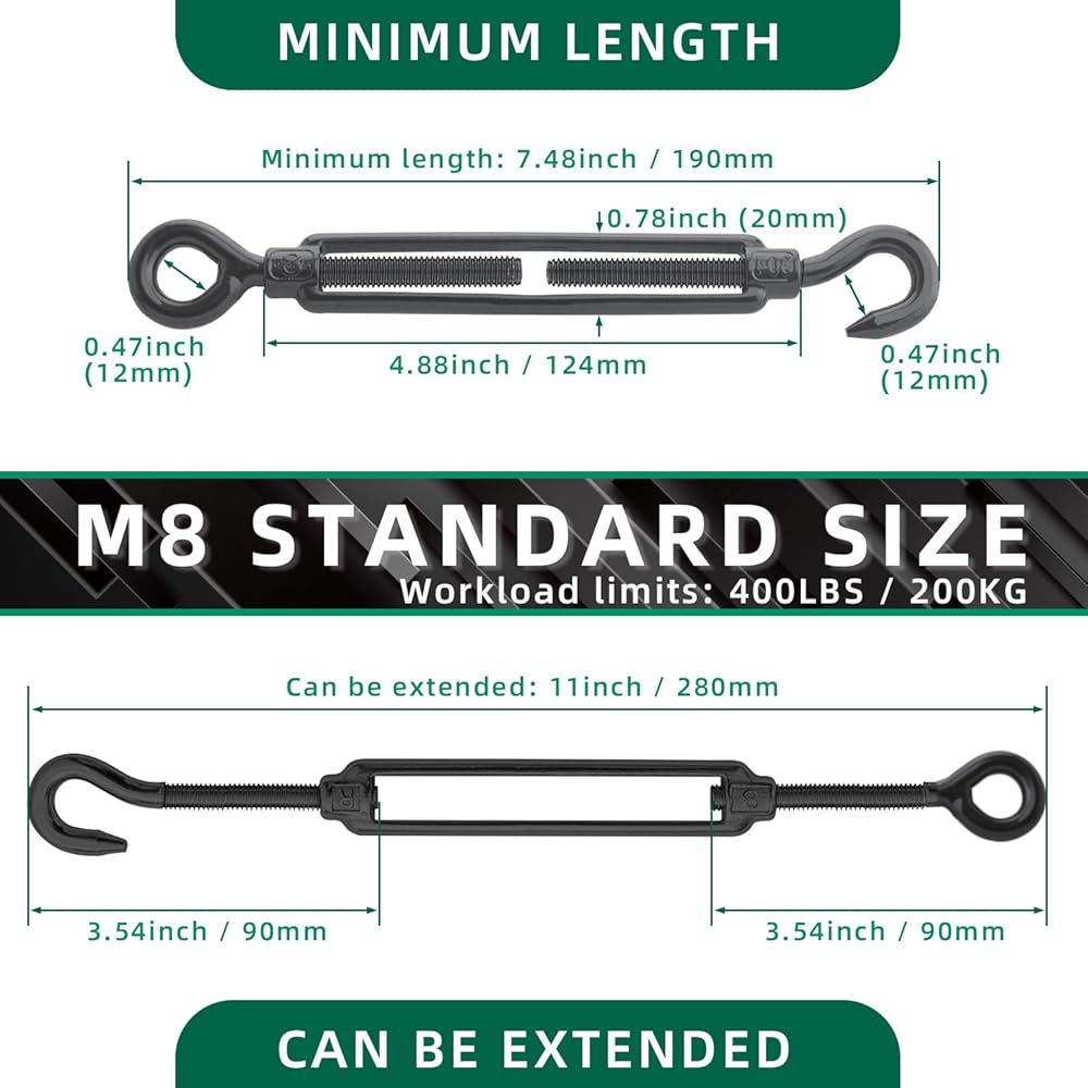 تصميم بحجم قابل للتعديل: شدادات M8 7.48 بوصة (190 مم)، الحد الأقصى للتمديد 11 بوصة (280 مم)، كلا الطرفين مصممان بإبزيم لولبي قابل للتعديل، والتي يمكن تدويرها وتعديلها وفقًا لمتطلبات الطول المختلفة