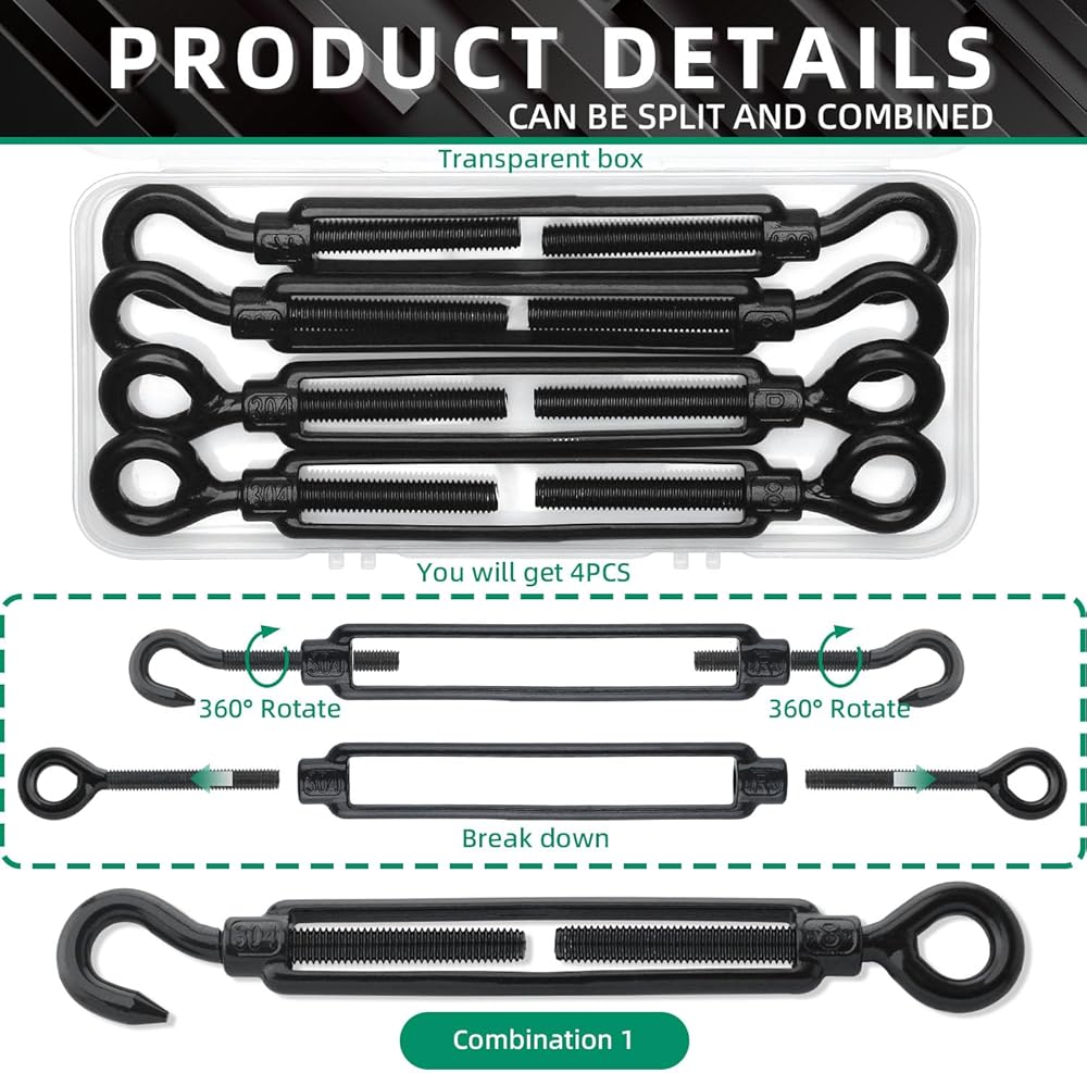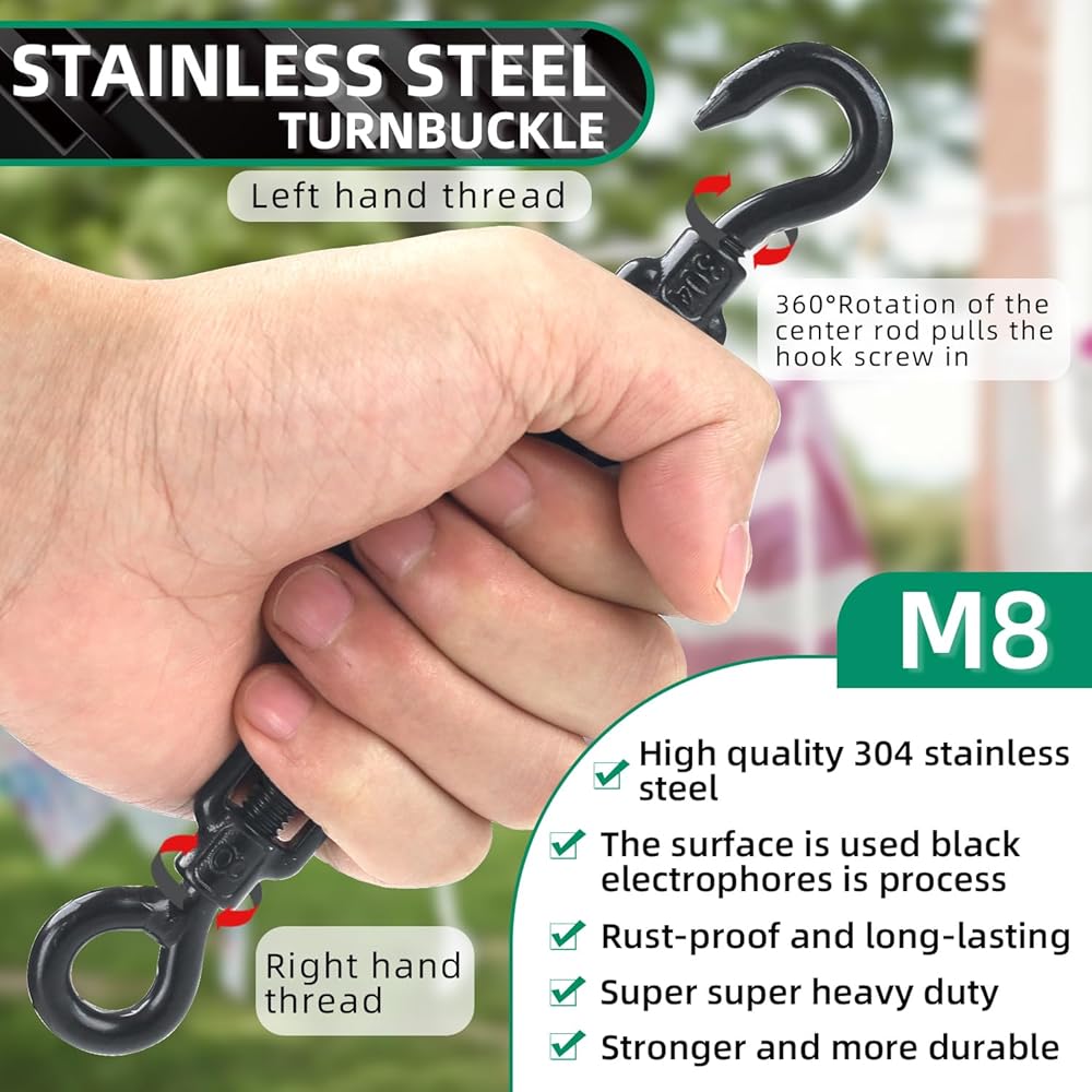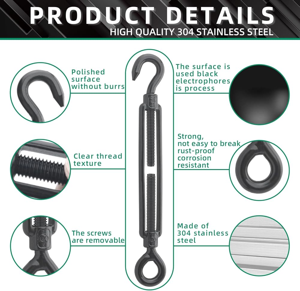 مواد عالية الجودة: شداد بإبزيم دوار مصنوع من الفولاذ المقاوم للصدأ 304، ويتم استخدام السطح الكهربائي الأسود لتعزيز مقاومة التآكل والصدأ للاستخدام في الأماكن المغلقة أو الهواء الطلق، سطح أملس، بدون نتوءات، آمن وموثوق في الاستخدام، ويمكن تستخدم بحرية في المطر