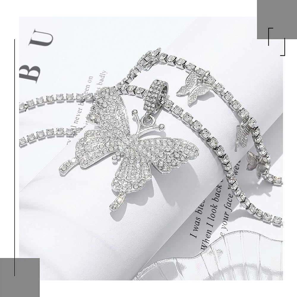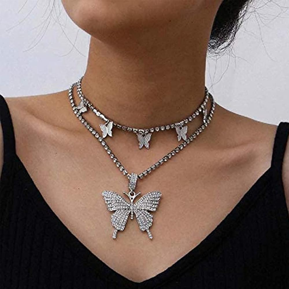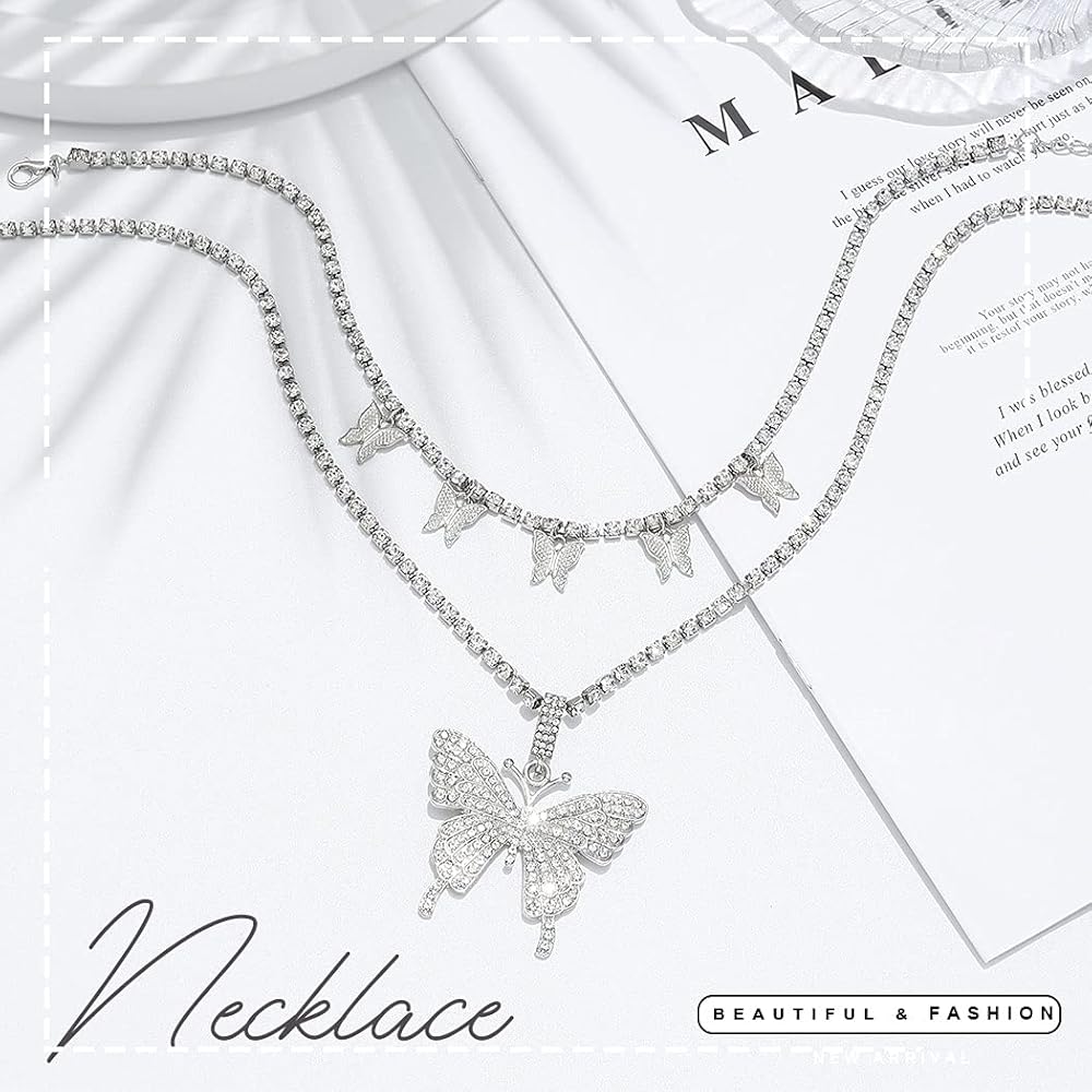 قلادة على شكل فراشة ذات طبقات مصنوعة من سبيكة عالية الجودة وحجر الراين. قلادة الفراشة اللامعة ناعمة في الارتداء ولا تحول رقبتك إلى اللون الأخضر.