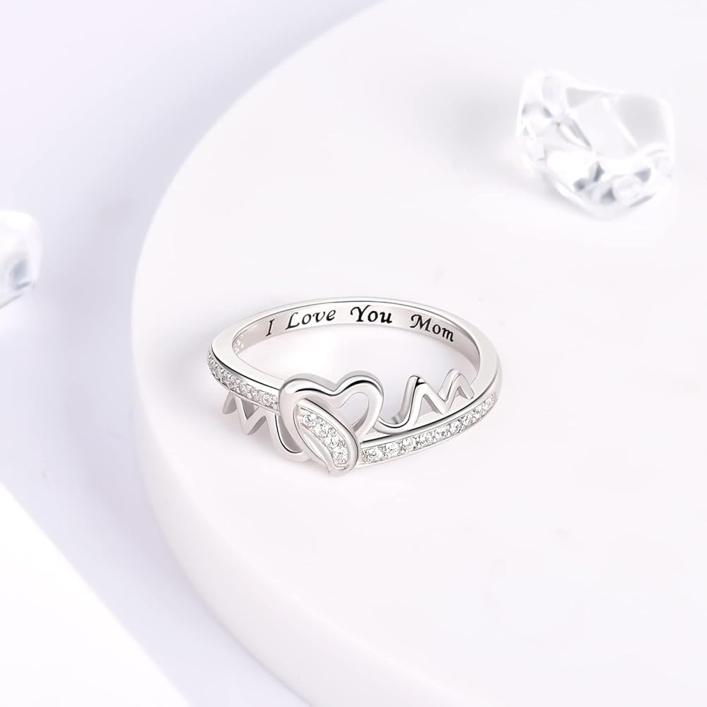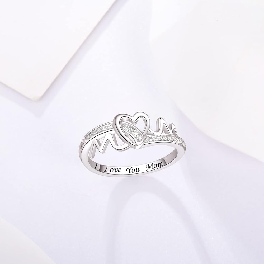 • التصميم: مصمم بخط MOM، مرصع بالزركونيا المكعبة. خاتم من الفضة الإسترلينية منقوش عليه عبارة "I love you Mom"، أفضل هدية للتعبير عن حبك لأمك في عيد الأم، أو عيد ميلاد الأم، أو عيد الشكر.