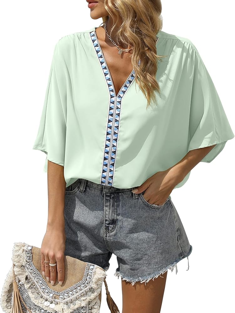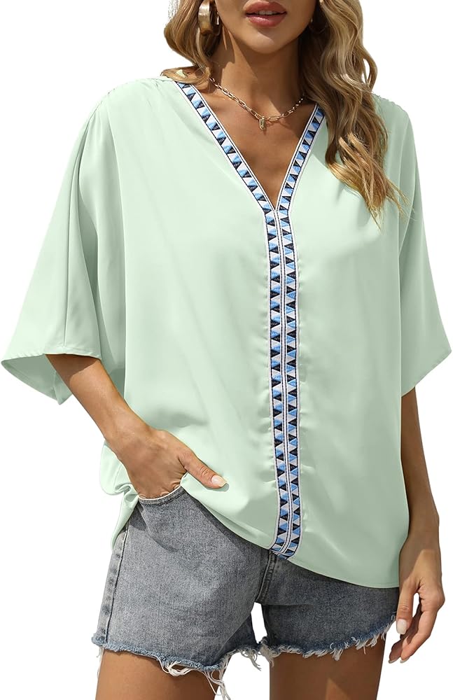 • 【نسيج شيفون】: بلوزة الشيفون هذه مصنوعة من البوليستر والألياف لدنة، والبلوزة ذات الرقبة على شكل حرف V مصنوعة من نسيج خفيف الوزن وناعم، ويحافظ القماش على جسمك بالكامل منتعشًا في الصيف.