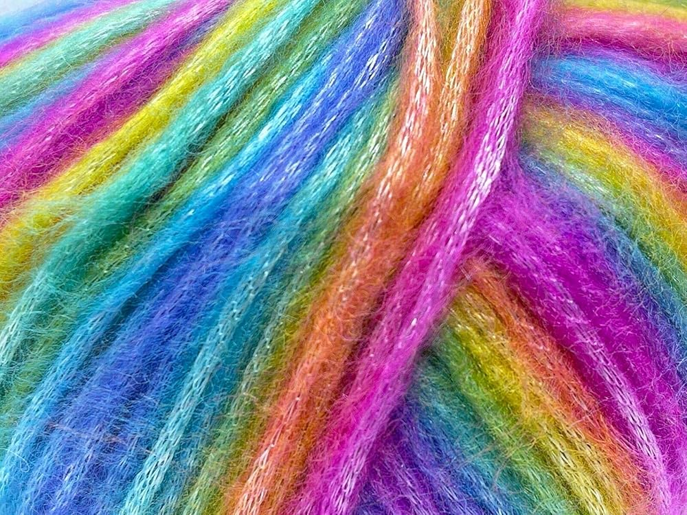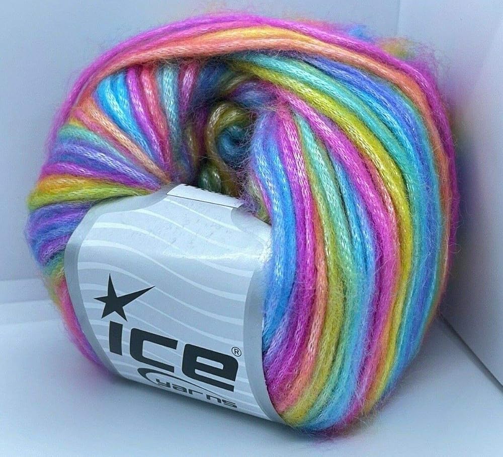 خيوط الجليد بيكاسو قوس قزح: أزرق، أرجواني، أخضر، أصفر، برتقالي، وردي غامض مع خيوط لامعة رقيقة، بوليستر، مزيج أكريليك 50 جرام 125 ياردة