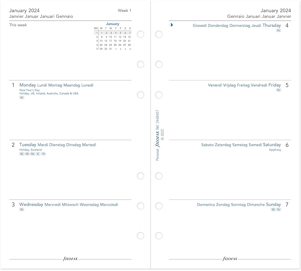 - عرض الأسبوع (WTV)، أسبوع على صفحتين، مخطط متعدد اللغات، إعادة تعبئة مذكرات التقويم المؤرخة متضمنة لعام 2024
