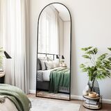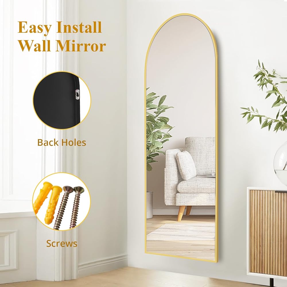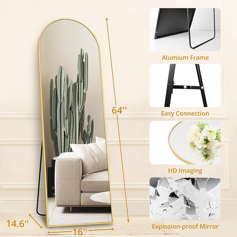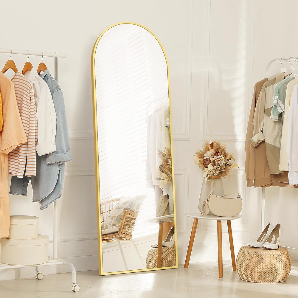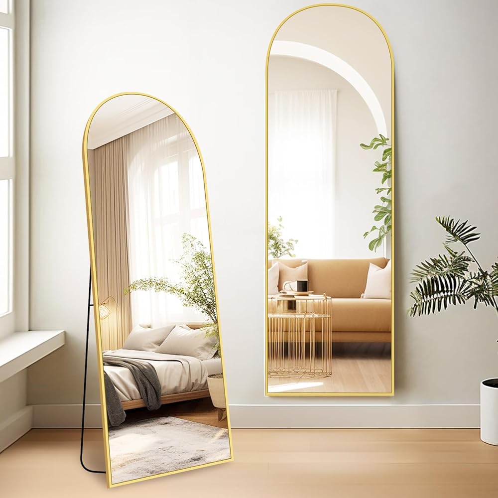 مرآة كاملة الطول مقوسة من Fabuday مع حامل - مرايا ذهبية بطول 64 بوصة × 21 بوصة بطول الأرضية لغرفة النوم، وغرفة المعيشة، وحامل مرآة جسم كبير مقوس، مؤطرة بالحجم الكامل، مائلة، معلقة ومثبتة على الحائط