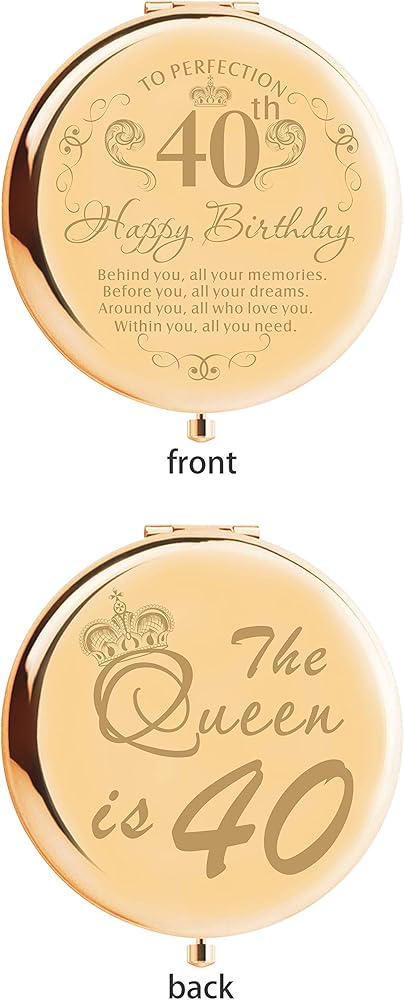 مرآة مدمجة لعيد الميلاد الأربعين: الجزء الأمامي من مرآة مكياج عيد الميلاد الأربعين منقوش عليه حروف "To Perfection 40th HAPPY BirtHDAY خلفك، كل ذكرياتك. قبلك، كل أحلامك. من حولك، كل من يحبك. بداخلك، كل ما تحتاجه" الظهر محفور عليه عبارة "الملكة عمرها 40". ستعيد ذكريات مذهلة عندما تستخدمها فتاة عيد الميلاد الأربعين في كل مرة.