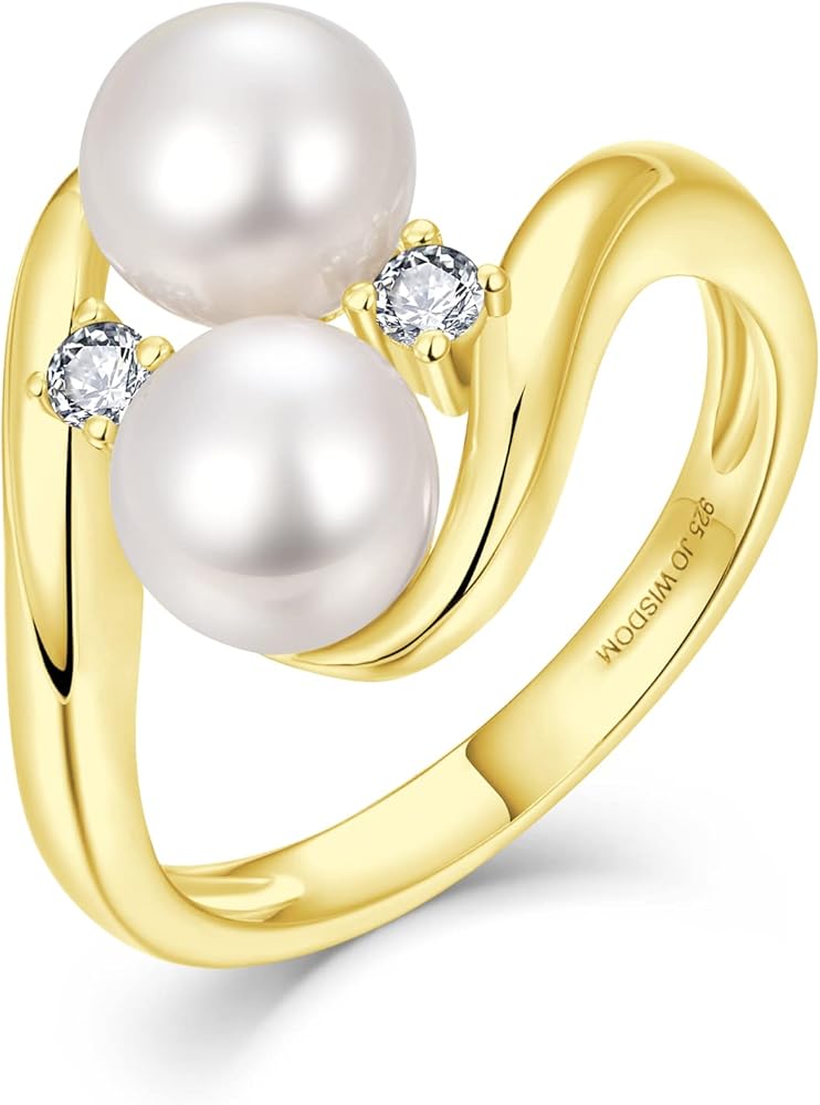 JO WISDOM خاتم اللؤلؤ، 925 فضة مكعب زركونيا خواتم نسائية ذهبية مع اثنين من اللؤلؤ 7 مم لؤلؤ المياه العذبة الأبيض المستزرع