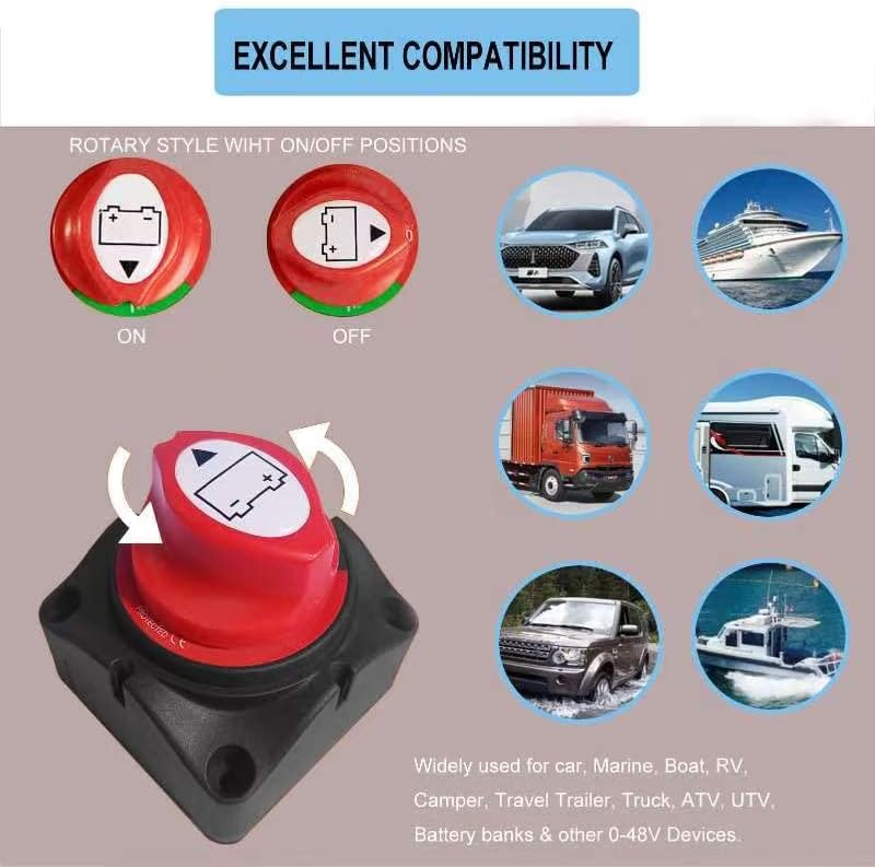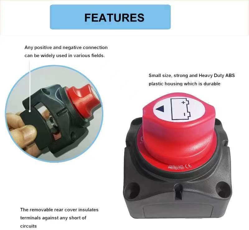 توافق ممتاز: يستخدم مفتاح فصل البطارية هذا لأنظمة تيار مستمر 12 فولت/24 فولت/48 فولت لعزل النظام الكهربائي وتأمينه. يمكن أن يكون مفتاح فصل البطارية البحرية هذا بمفرده أو يتم قفله مع مفتاح آخر، مما يوفر طريقة موثوقة لإيقاف الطاقة الكهربائية أثناء الصيانة، وحماية البطاريات من التصريف الزائد، وطريقة اقتصادية وبسيطة لفصل البطاريات.