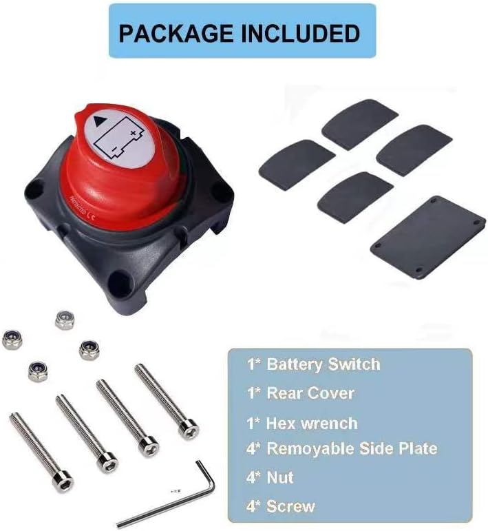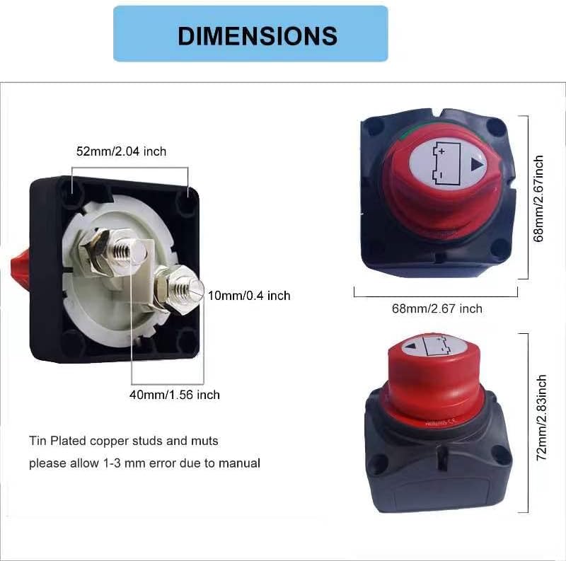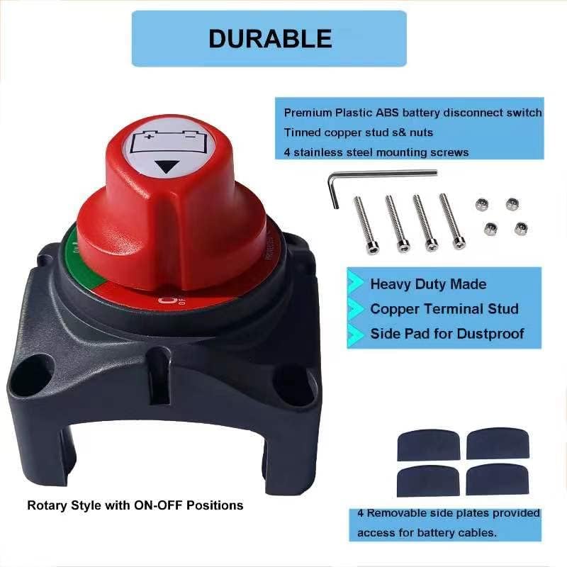 【فصل قوي ومغلق بالكامل】مسامير وصواميل نحاسية معلب: مصحوبة بأغطية و4 براغي تثبيت من الفولاذ المقاوم للصدأ للمساعدة في تثبيت المفتاح بإحكام. تحتوي مفاتيح فصل البطارية 12 فولت على غلاف بلاستيكي ABS عالي التحمل، و4 لوحات جانبية قابلة للإزالة توفر إمكانية الوصول لكابلات البطارية لحماية الأسلاك من الأوساخ والمطر.
