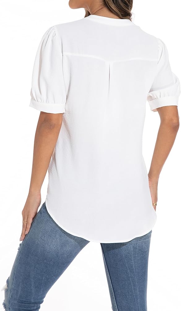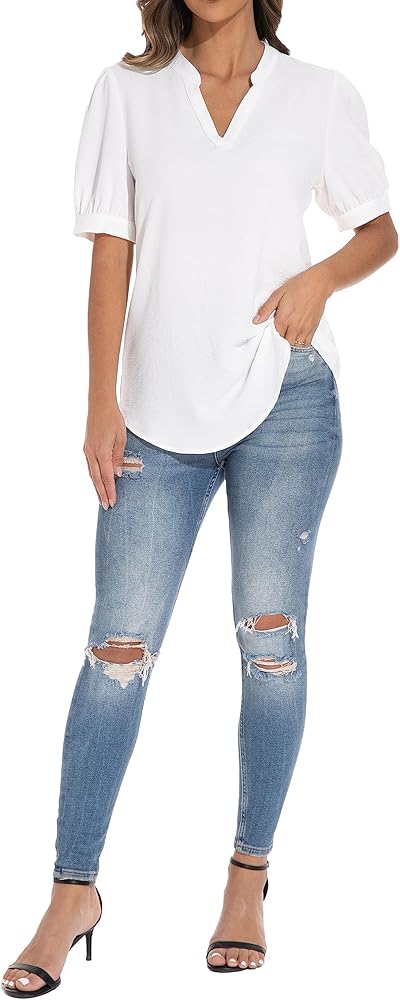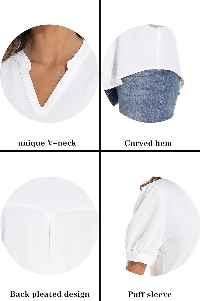 تصميم فريد - لون سادة أنيق مع لمسة أنثوية. تتميز الأكمام المنتفخة بنمط النقاط السويسرية مع تصميم فريد على شكل حرف V يبرز الرقبة والذراعين، مما يجعلك تبدين نحيفة وساحرة وأنيقة.