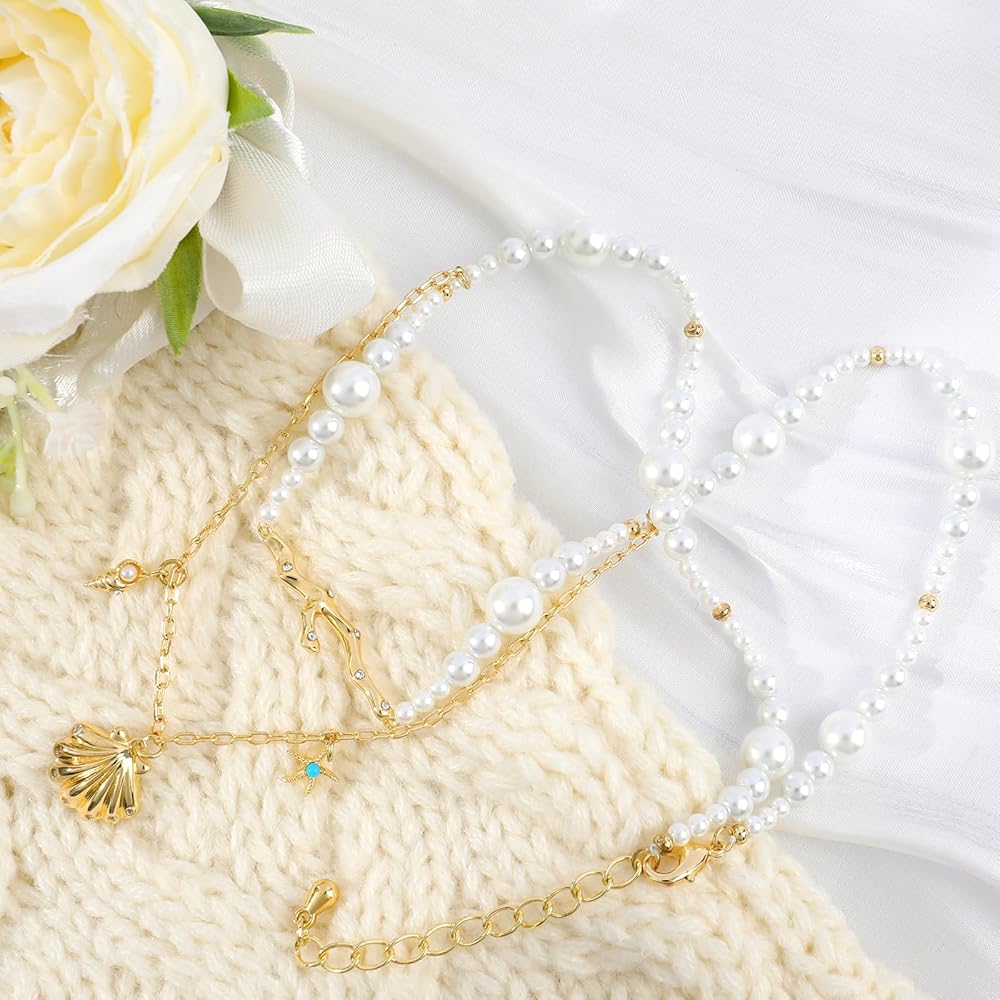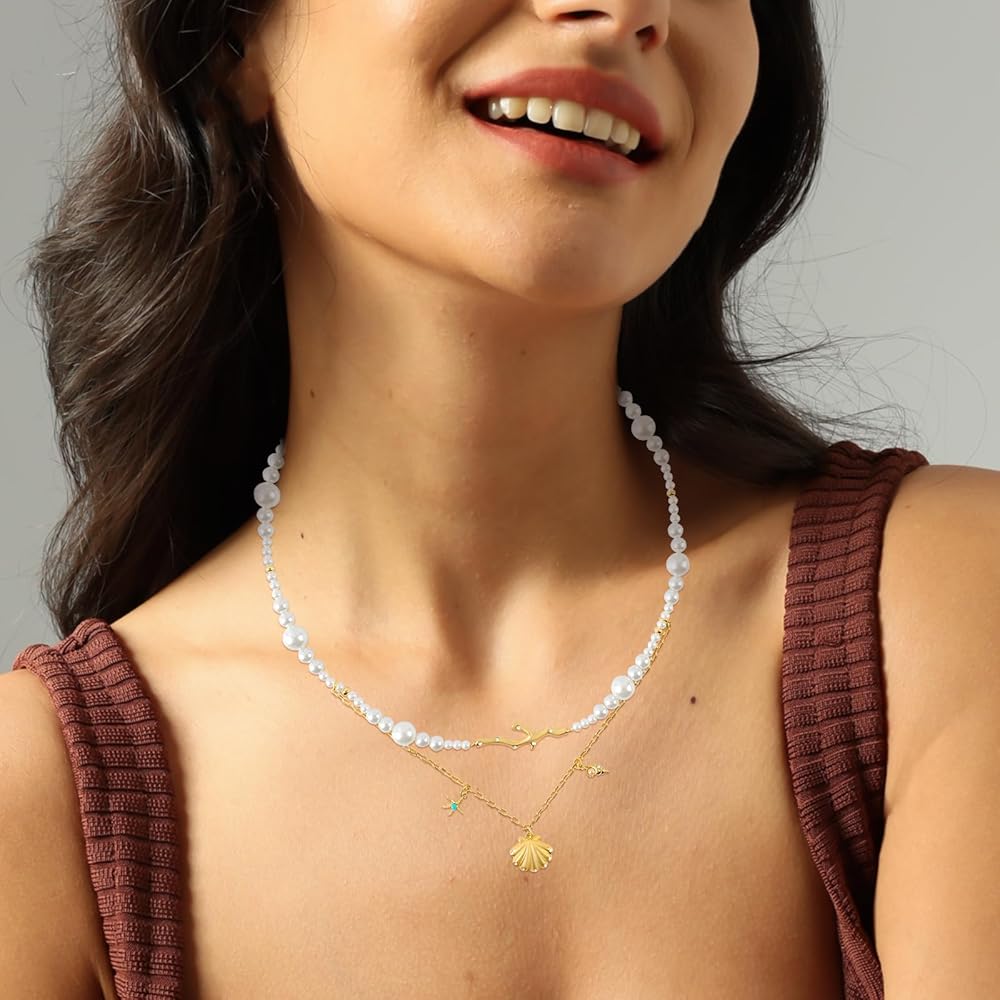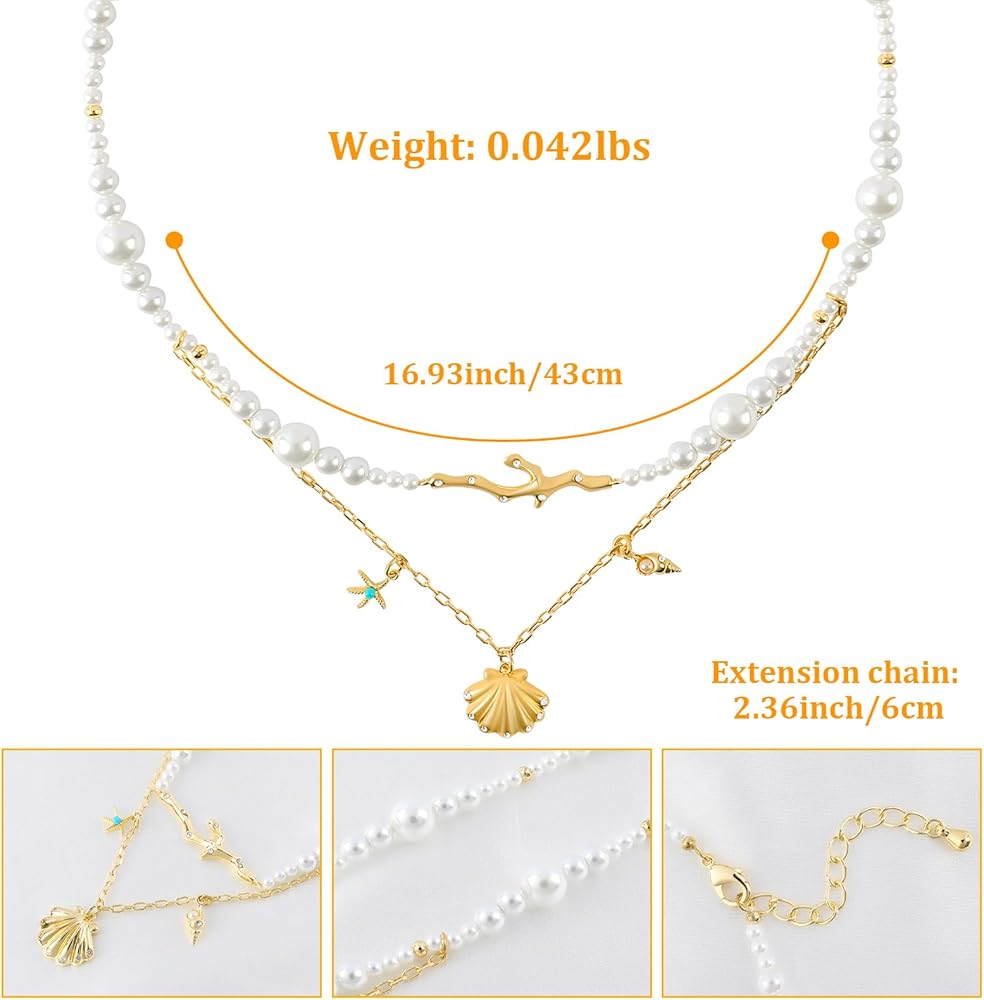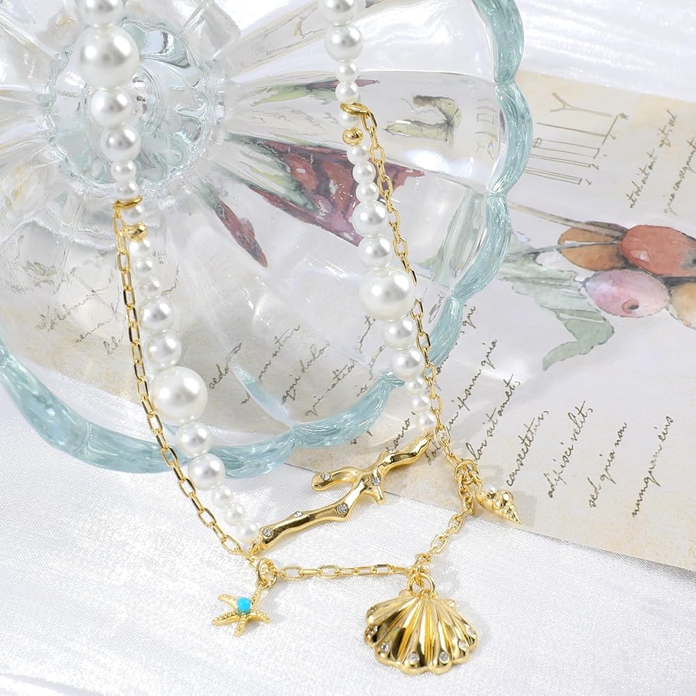 الطبقات الذهب شل قلادة اللؤلؤ المختنق قلادة للنساء مع المرجان وتدلى نجم البحر محارة سحر قلادة قابل للتعديل 14K مطلية بالذهب ربط سلسلة نجمة البحر الصيف شاطئ المحيط المجوهرات هدية للفتيات