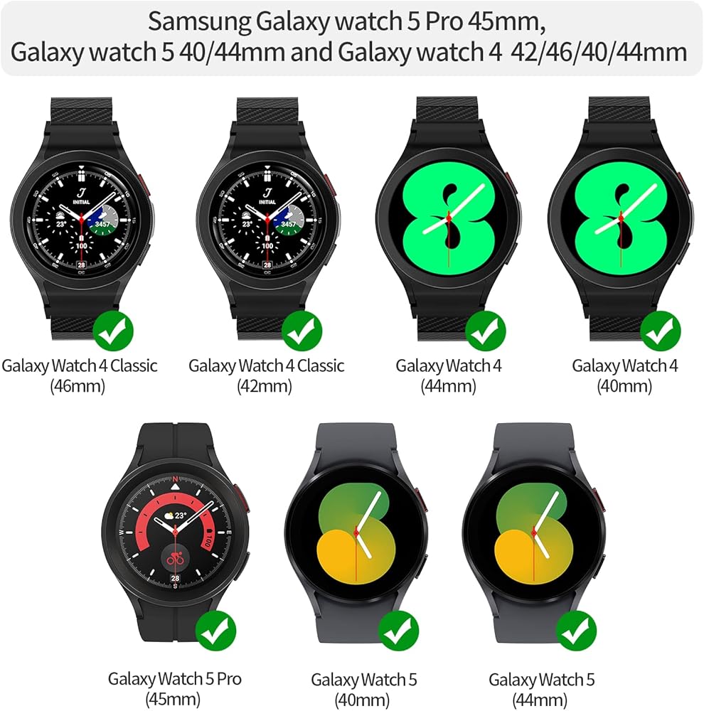 • [التوافق]: هذا الحزام مناسب لساعة Samsung Galaxy Watch 5 Pro 45 مم، Galaxy Watch 6/5/4 40 مم 44 مم/Galaxy Watch 4/6 Classic 42 مم 46 مم 43 مم 47 مم. يرجى شراء السوار المقابل وفقًا لطراز وحجم ساعتك. ملحوظة: غير متوافقة مع ساعة Samsung Galaxy Watch 2019 مقاس 46 مم (سوار المعصم يناسب المعصم من 5.3 بوصة إلى 8.3 بوصة)