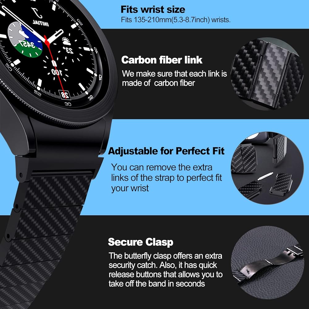 • [حزام نمط العمل]: حزام ألياف الكربون الأسود يجعل الساعة الذكية تندمج في نمط العمل. يناسب الرأس المنحني للسوار بشكل مثالي سوار Galaxy Watch 6/5/4 الخاص بك. تصميم عصري راقي، بدون درزات، بغض النظر عن الرياضة أو الكاجوال أو اليومي أو الحفلات أو العمل، فهو يقدم مظهرًا احترافيًا جميلاً في أي مناسبة.